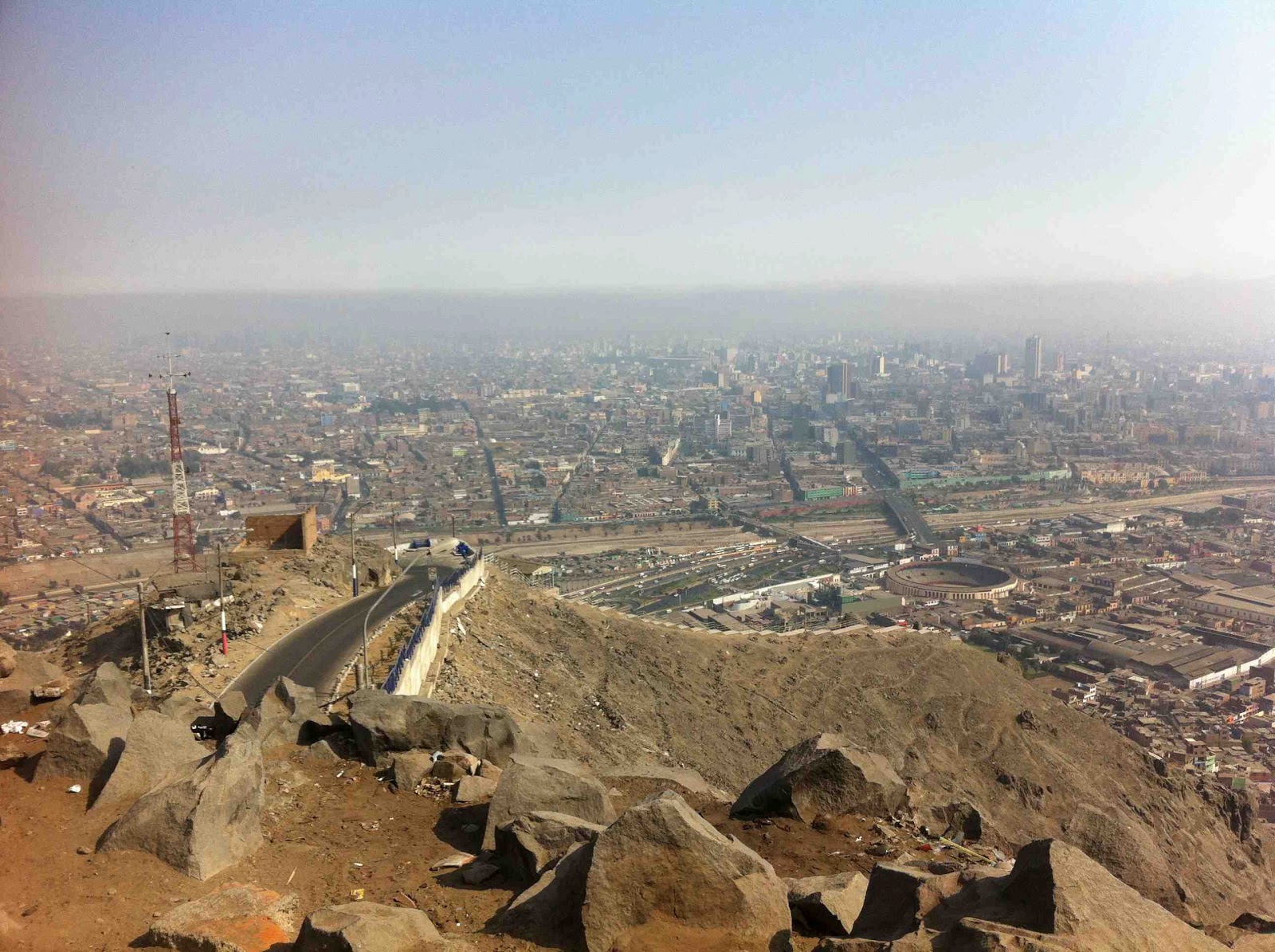 Do hostelu jsem dorazil kolem 14. hodiny odpoledne a zbytek dne jsem se tak různě procházel kolem. Druhý den jsem si prve jel koupit lístek na noční autobus do Huarazu a pak jsem pěšky došel do centra, kde jsem strávil v podstatě zbytek dne. Na hlavním náměstí Plaza de Armas (tak se jmenuje skoro každé hlavní náměstí v Peru) jsem se zašel podívat do kostela a koho to nevidím – známou skupinu Moraváků, kterou jsem potkal při přestupu v Sao Paulu. Dali mi tip, že dál přes řeku je nějaký zajímavý kostel či co. Tak jsem se pomalu vydal tím směrem. Když jsem se podíval tím směrem, tak jsem viděl takový výrazný kopec a nahoře kříž. Hned jsem si vzpomněl na historku, kterou mi psal Aleš, co tu byl měsíc přede mnou. Varoval mě, abych nešel na kopec s křížem, že ho tam přepadl nějaký taxikář s rozbitou flaškou v ruce. Měl jsem za to, že povídal o nějakém kopci u Miraflores a ne v centru. Tak jsem si říkal, že se tam vydám. Celý kopec je pokrytý slumy, ale neměl jsem pocit, že by to bylo nějak nebezpečné tam jít – přece jen všude kolem byli lidi. Postupoval jsem nahoru a v jednom místě posedávali místní flákači a popíjeli pivo. Hned mě zdravili, tak jsem si říkal, že teda si s nima chvilku popovídám (podotýkám, že španělsky neumím). Oni povídali cosi že Berdych. No a vtom přijelo zdola policejní auto. A že prý co tam dělám. Já říkám, že jdu nahoru. A oni cosi jako že ať si nastoupím. Tak jsem si teda nastoupil a z jejich posunků jsem pochopil, že mi chtějí říct, že je to nebezpečné a že mě můžou okrást. Jeden z nich dokonce zavolal svému synovi a dal mi ho k telefonu, aby mi to anglicky vysvětlil. Poděkoval jsem a nahoře na kopci jsem se s nima rozloučil. Nahoře byl hezký výhled na Limu.
