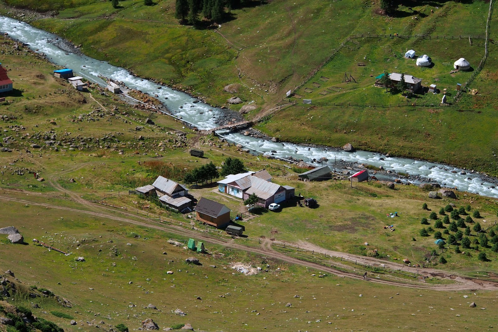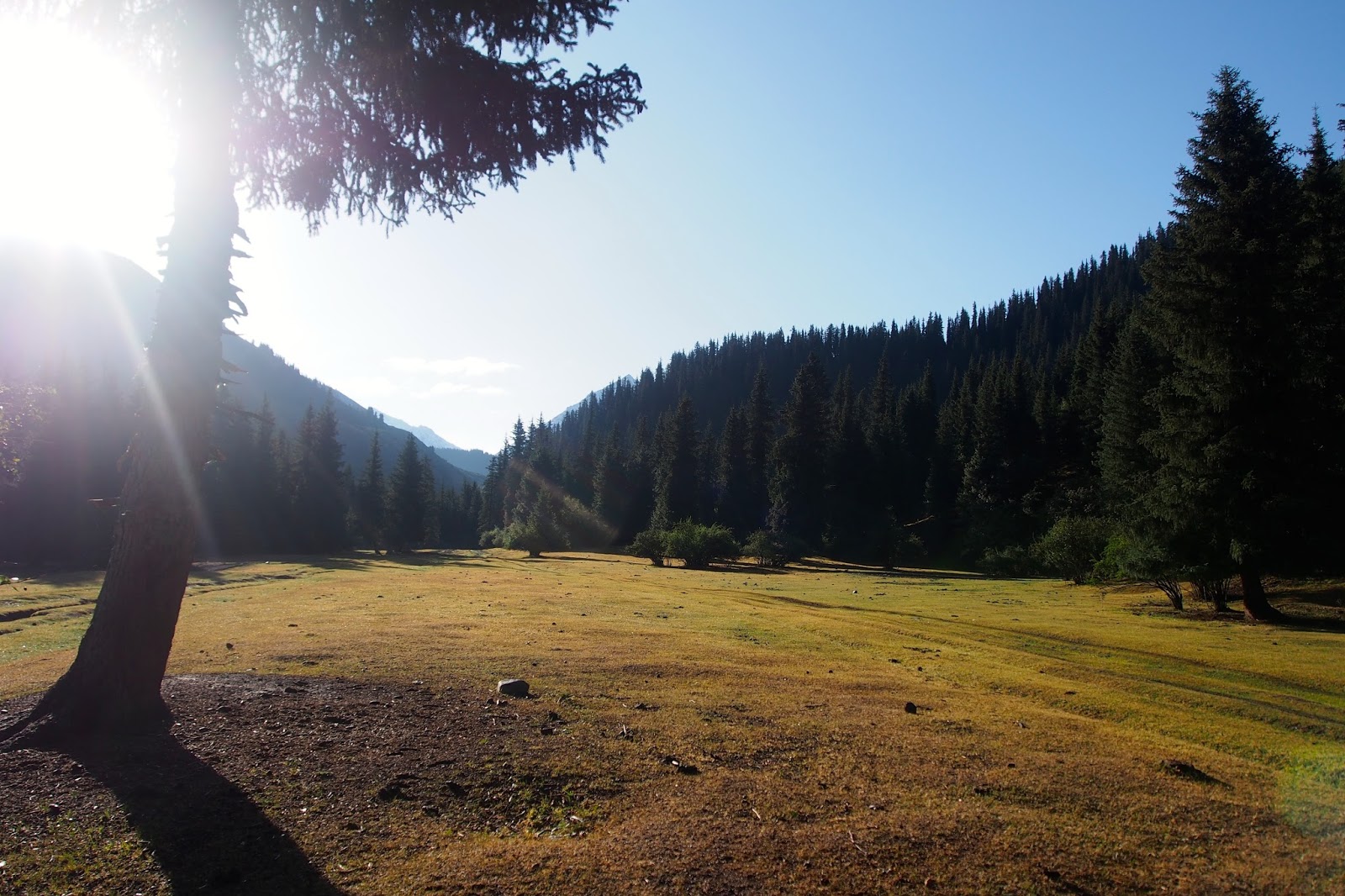 Pak už jsme pokračovali dolů pomalu společně. Bylo to úmorné. Někdy v 5 jsme konečně dorazili do osady Altyn Arašan. Je to vlastně několik kempů (odhadem 5), kde každý patří jedné cestovce a většinou je tam 1 cihlový dům a někdy soukromé lázně / horký pramen. Místo horkého pramene jsme si dali pivo a uvařili polentu. Max prohodil, že jako jestli si nechci vylézt na kopeček nad kempem (když jsem tak akční). Tak jsem se rozhodl, že to udělám další den ráno.