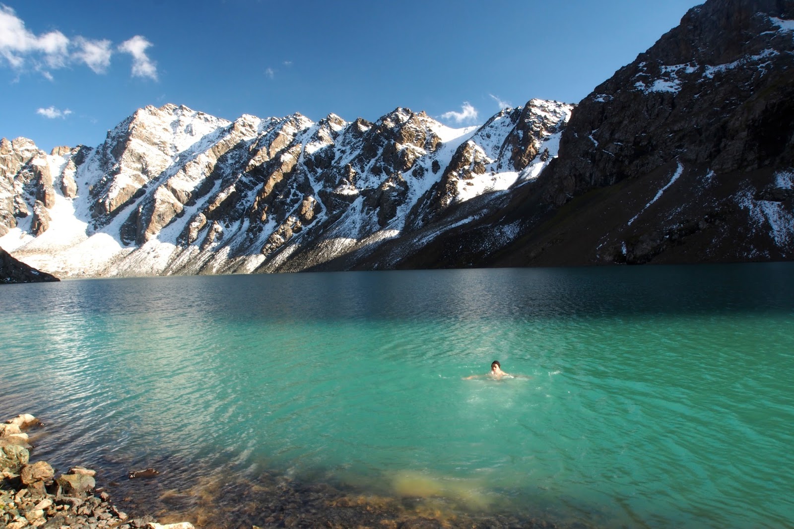 Dole jsem byl za další půlhodinu. Max a Maud už byli pryč. Po 11. jsme vyrazili údolím dolů směrem do Karakolu. Ale ještě před tím jsme odbočili dolů k řece, kde po 15 min chůze byl vybudovaný bazének s horkým pramenem. No, spíš teplým – mělo to tak 25 stupňů. Trochu jsem si v tom poležel a pak se zchladil v řece. A pak ještě jednou.