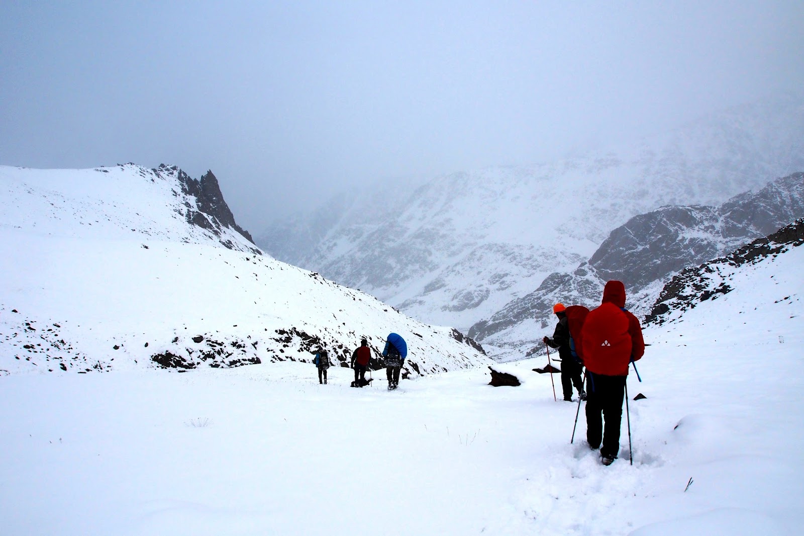 Do sedla Teleti (3700 m) jsme došli chvíli před 18. hodinou – hrozně pozdě (světlo je asi do půl 9. večer). Chvíli se čekalo, kdo vyrazí dolů – doufali jsme, že se do toho pustí místní, ale oni ještě furt nebyli v sedle, protože čekali na jednoho pomalého nosiče. Došli po pár minutách, ale nakonec dolů vyrazili Rusi. Pěkně foukalo a k tomu sněžilo, takže jsme se potřebovali začít hýbat, abychom nezmrzli. Mimochodem, i ti místní říkali, že tolik sněhu snad nepamatují a že to opravdu není běžné.
