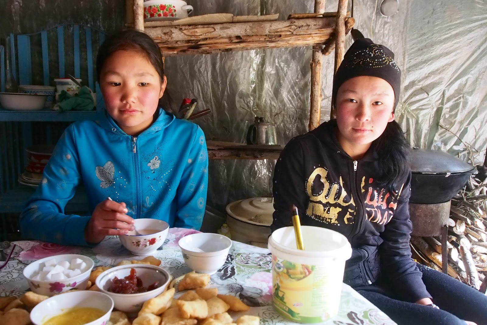 Holky se k nám po chvilce přidaly, a tak jsme tam seděli a trochu se bavili, co nám naše znalosti ruštiny dovolily. Zvlášť ta menší holka se hrozně smála pokaždé, když jsme nějaké slovíčko vyslovili v češtině nebo polštině. Mezi tím jsme jim taky dali chleba s čerstvým sýrem a rajčaty. Byla to dobrota, taky jsme si pochutnali. Holky pak udělaly čaj. Dozvěděli jsme se, že už jsou tam v kuse asi 5 dní a normálně žijou v Jeti Oguz. Měly tam krávu a kozu. Rodiče prý že zrovna byli v Karakolu.
