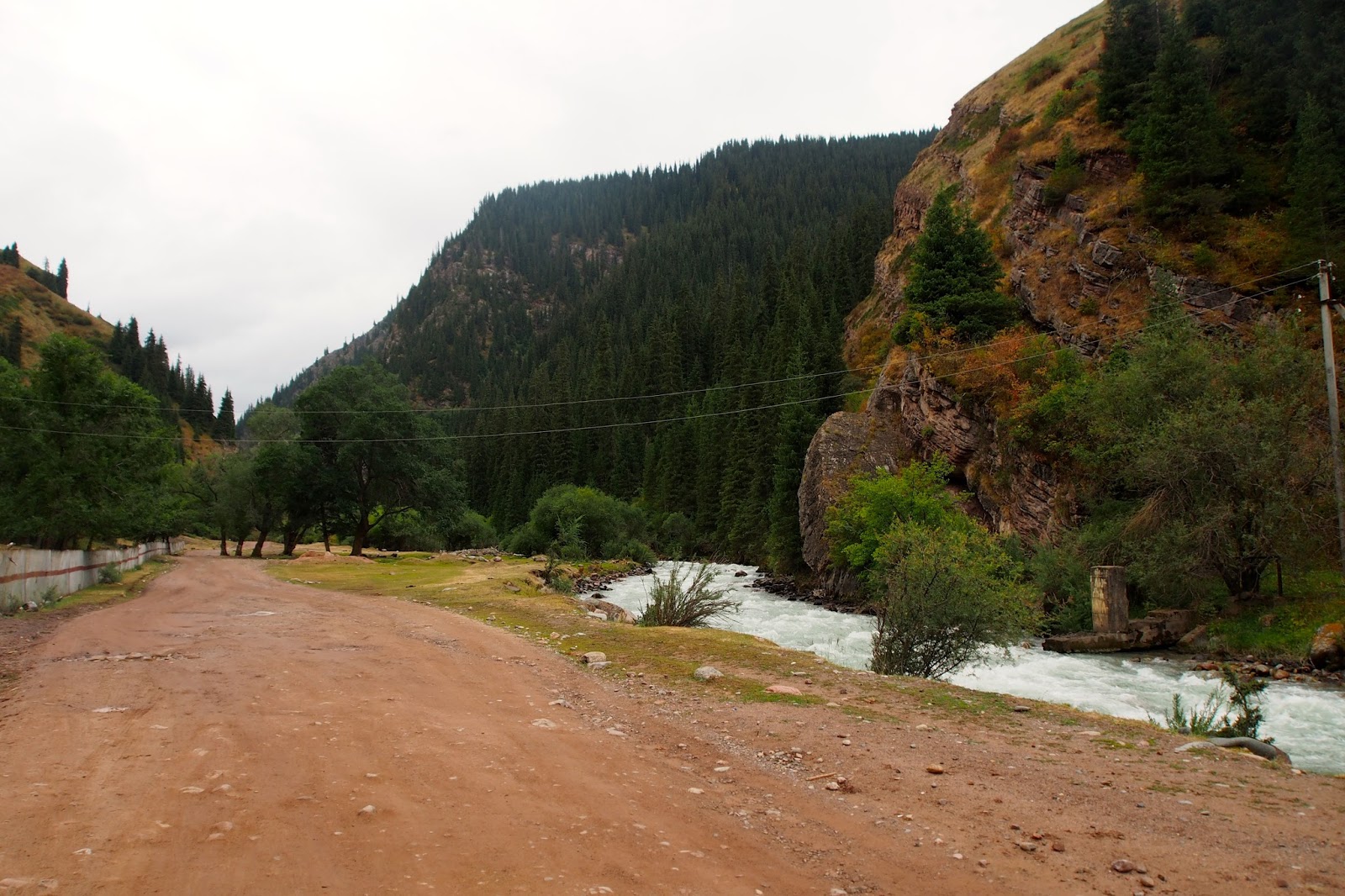 Vstali jsme v 7, nasnídali se, dobalili věci a v 8 jsme se vydali taxíkem (60 som, 25 Kč) na hlavní trh, kde jsme chtěli chytit maršrutku do Jeti Oguz – startu našeho výletu. Nakonec to bylo spíš taxi, které jsme sdíleli s paní, co učí na univerzitě v Biškeku a jela na svoji pravidelnou dovolnou do sanatoria, které je na konci Jeti Oguz a kde končí silnice – dál už je jen polňačka. Hrozně se chtěla bavit a pocvičit si angličtinu. Její dcera prý žije v USA. Paní nás přemlouvala, abychom zůstali jeden den s ní v sanatoriu, že si popovídáme a dobře se najíme. Nakonec jsme odmítli s tím, že už chceme konečně do přírody.