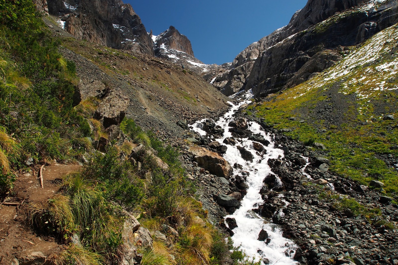 Cesta dolů byla docela příjemná, jak se člověk klouzal sněhem. Skupinka s Izraelci i Češi se nám postupně ztratili někde vzadu a když jsme došli k rovnějšímu úseku u řeky, Rusové se rozhodli utábořit (na sněhu). Nadhodil jsem, jestli taky nezůstaneme, ale Kami se klonila k tomu, abychom pokračovali. Blížila se 8. hodina večerní a stmívalo se. Cesta byla matně zřetelná, někdy skoro vůbec.