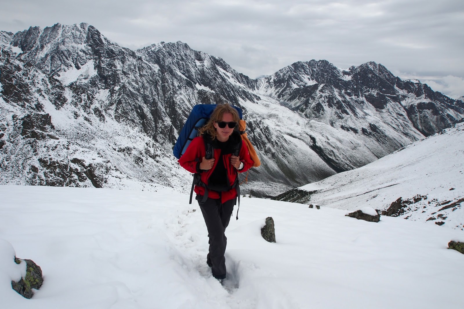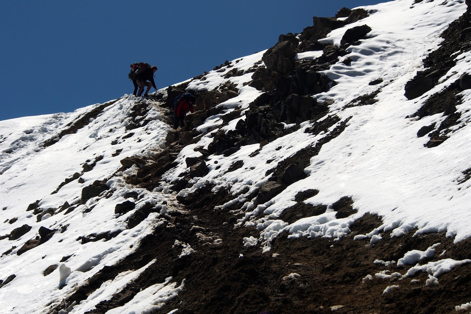 Do sedla Teleti (3700 m) jsme došli chvíli před 18. hodinou – hrozně pozdě (světlo je asi do půl 9. večer). Chvíli se čekalo, kdo vyrazí dolů – doufali jsme, že se do toho pustí místní, ale oni ještě furt nebyli v sedle, protože čekali na jednoho pomalého nosiče. Došli po pár minutách, ale nakonec dolů vyrazili Rusi. Pěkně foukalo a k tomu sněžilo, takže jsme se potřebovali začít hýbat, abychom nezmrzli. Mimochodem, i ti místní říkali, že tolik sněhu snad nepamatují a že to opravdu není běžné.