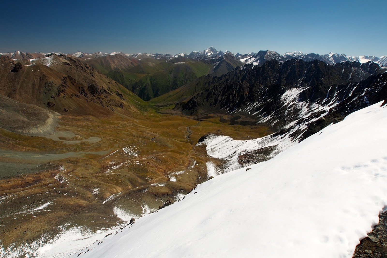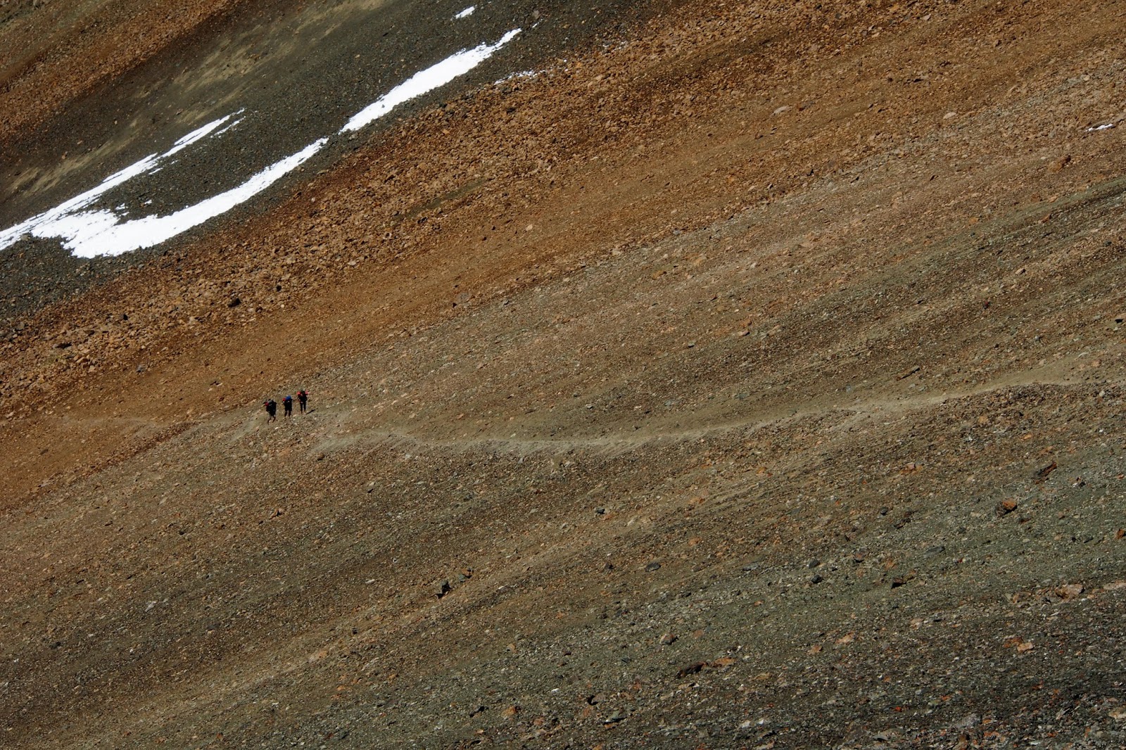 Byli jsme teprv ve výšce 2200 m a čekal nás výstup do sedla Teleti ve výšce 3700 m. Pomalu jsme stoupali údolím a pomalu se začínal objevovat sníh. Potkali jsme skupinku turistů, kteří se předchozí den neúspěšně pokusili o přechod sedla a teď se vraceli zpět do Jeti Oguz.
