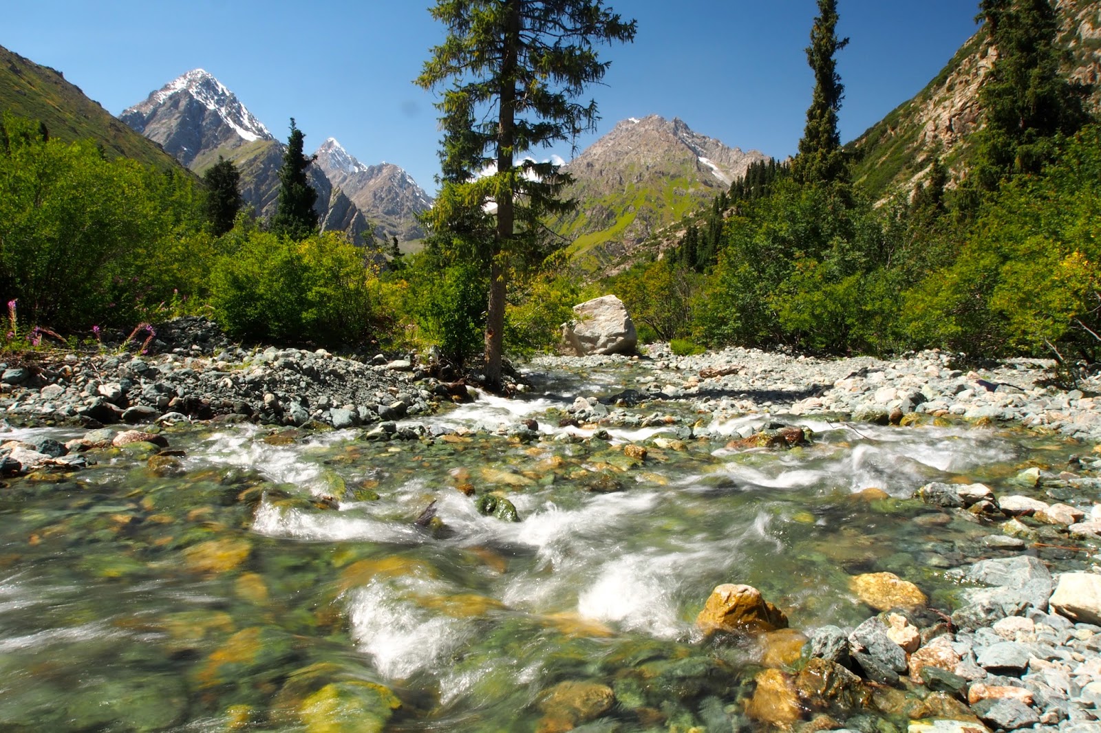 Vstali jsme v 7, nasnídali se, dobalili věci a v 8 jsme se vydali taxíkem (60 som, 25 Kč) na hlavní trh, kde jsme chtěli chytit maršrutku do Jeti Oguz – startu našeho výletu. Nakonec to bylo spíš taxi, které jsme sdíleli s paní, co učí na univerzitě v Biškeku a jela na svoji pravidelnou dovolnou do sanatoria, které je na konci Jeti Oguz a kde končí silnice – dál už je jen polňačka. Hrozně se chtěla bavit a pocvičit si angličtinu. Její dcera prý žije v USA. Paní nás přemlouvala, abychom zůstali jeden den s ní v sanatoriu, že si popovídáme a dobře se najíme. Nakonec jsme odmítli s tím, že už chceme konečně do přírody.
