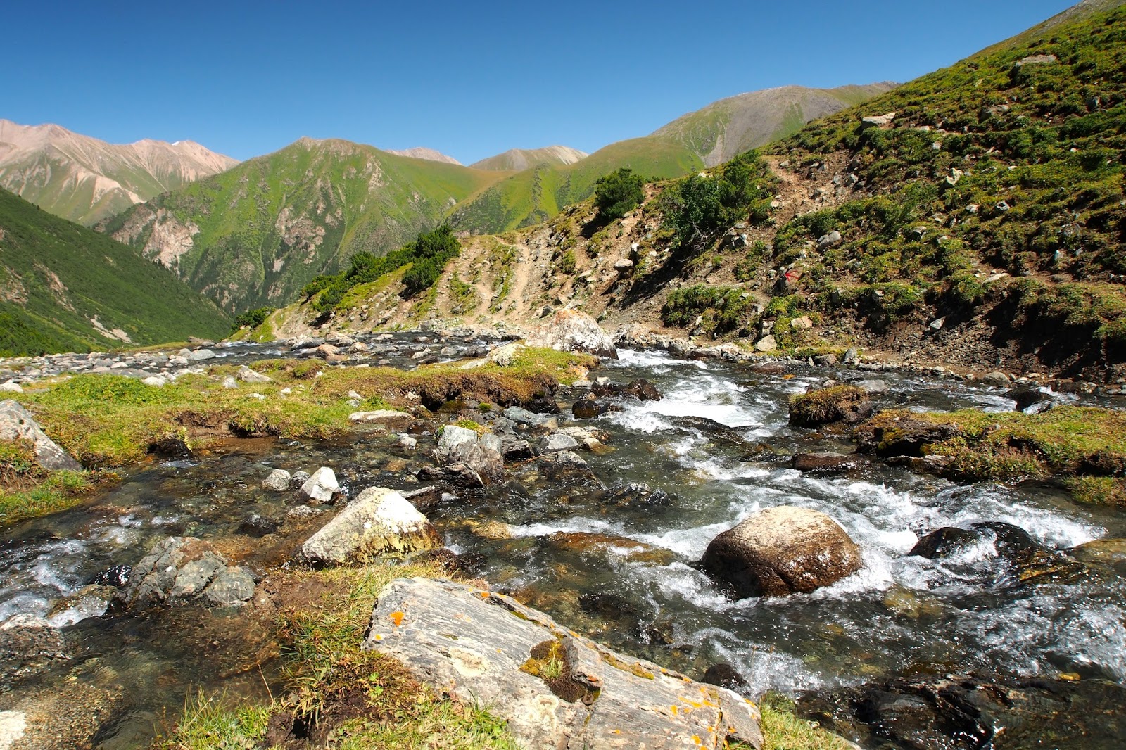 Dole jsem byl za další půlhodinu. Max a Maud už byli pryč. Po 11. jsme vyrazili údolím dolů směrem do Karakolu. Ale ještě před tím jsme odbočili dolů k řece, kde po 15 min chůze byl vybudovaný bazének s horkým pramenem. No, spíš teplým – mělo to tak 25 stupňů. Trochu jsem si v tom poležel a pak se zchladil v řece. A pak ještě jednou.