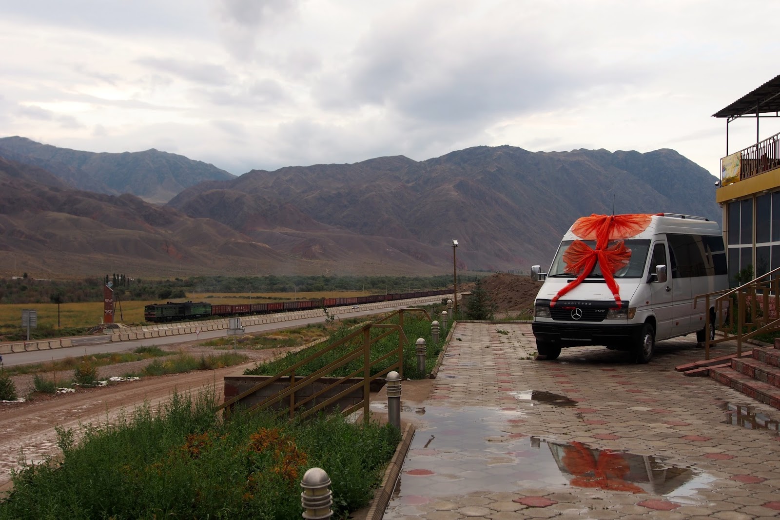 Pauza na odpočívadle. Povšimněte si vlaku. Napadlo nás, že by mohlo být fajn jet vlakem. Později jsem se dozvěděl, že vlak jeden jen do Balukči, což není ani v půlce cesty, a trvá mu to 5 hodin (maršrutka jede do Karakolu 6 hodin včetně pauzy).
