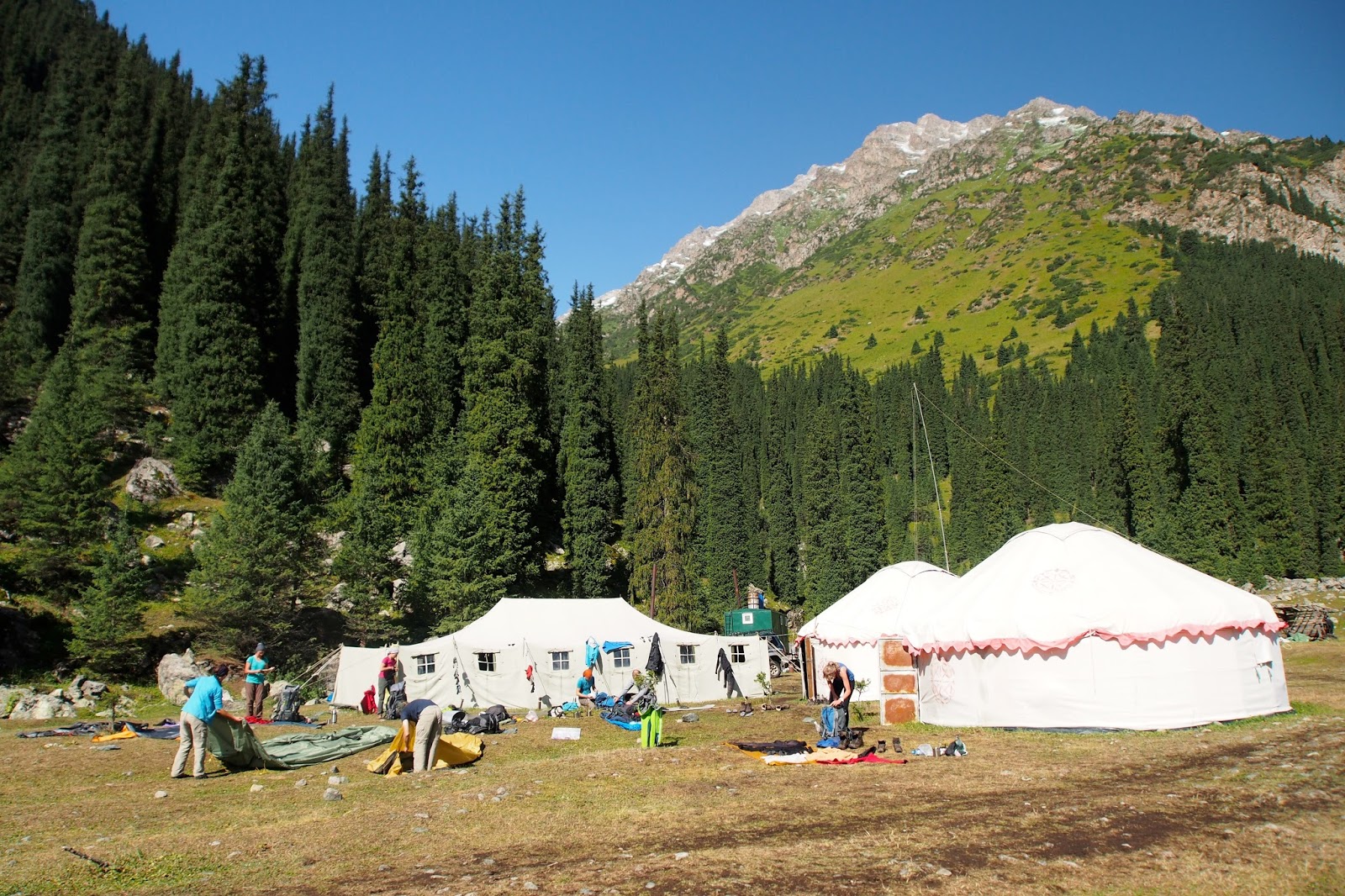 Najednou zničehonic to skončilo! Ocitli jsme se na rovné polňačce, která vedla podél řeky. Byla to úleva. Cesta znamená civilizaci a bezpečí. Rozhodli jsme se, že půjdem dál a uvidíme, jestli třeba do hodiny dojdem k nějaké jurtě. Bylo asi 21:15. Po půlhodině chůze jsme v dálce uviděli několik světel. Super! Někdy chvíli po 10. večer jsme konečně došli – byl to Karakol Base Camp (2400 m). Dokonce pro nás bylo místo v jurtě – už jsem toho měl dost, abych ještě stavěl stan. Prý mám jít do maringotky zaplatit. Uvnitř byl místní ranger, který vybíral vstupné do parku (250 som) a pán s knírkem, co mu patřily jurty (250 som za nocleh). Prý jestli chci vodku. Řekl jsem, že jsme moc nepili a jestli spíš nemá čaj. A on že jo a nalil mi celou konvičku! Perfektní!