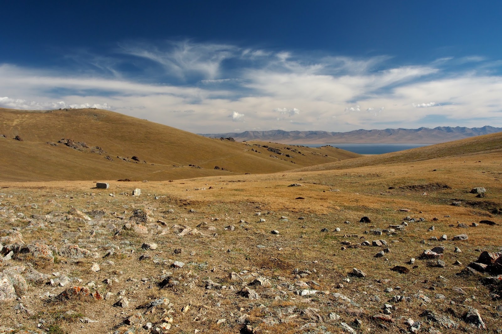 Někdy po sedmé jsme se rozhodli utábořit u jezera kousek od nějaké jurty. Zjistili jsme, že úplně u jezera není dobrý kempovat, protože tam lítaj takoví otravní komáři, co sice nějak neštípali, ale byli otravní i tak – bylo jich hrozně moc a byli všude. Takže jsme si stan postavili tak 50 m od břehu, ale i to se ukázalo jako málo. Trochu jsme měli obavy z vlků, i když nejspíš neopodstatněný – sice tam v té oblasti vlci jsou, ale asi ne úplně takhle u jezera, kde se přece jen nějací lidi pohybujou. Nicméně moc jsem se nevyspal – u té jurty poblíž byli 2 psi, který to tam hlídali. No a v noci se odněkud vzal třetí pes a furt na sebe štěkali, navíc ten cizí pes byl hodně blízko našeho stanu. Kolem půlnoci takto štěkali tak půl hodiny, pak nic a pak ve 2 znovu. Pak už ten pes jen tak sípal.