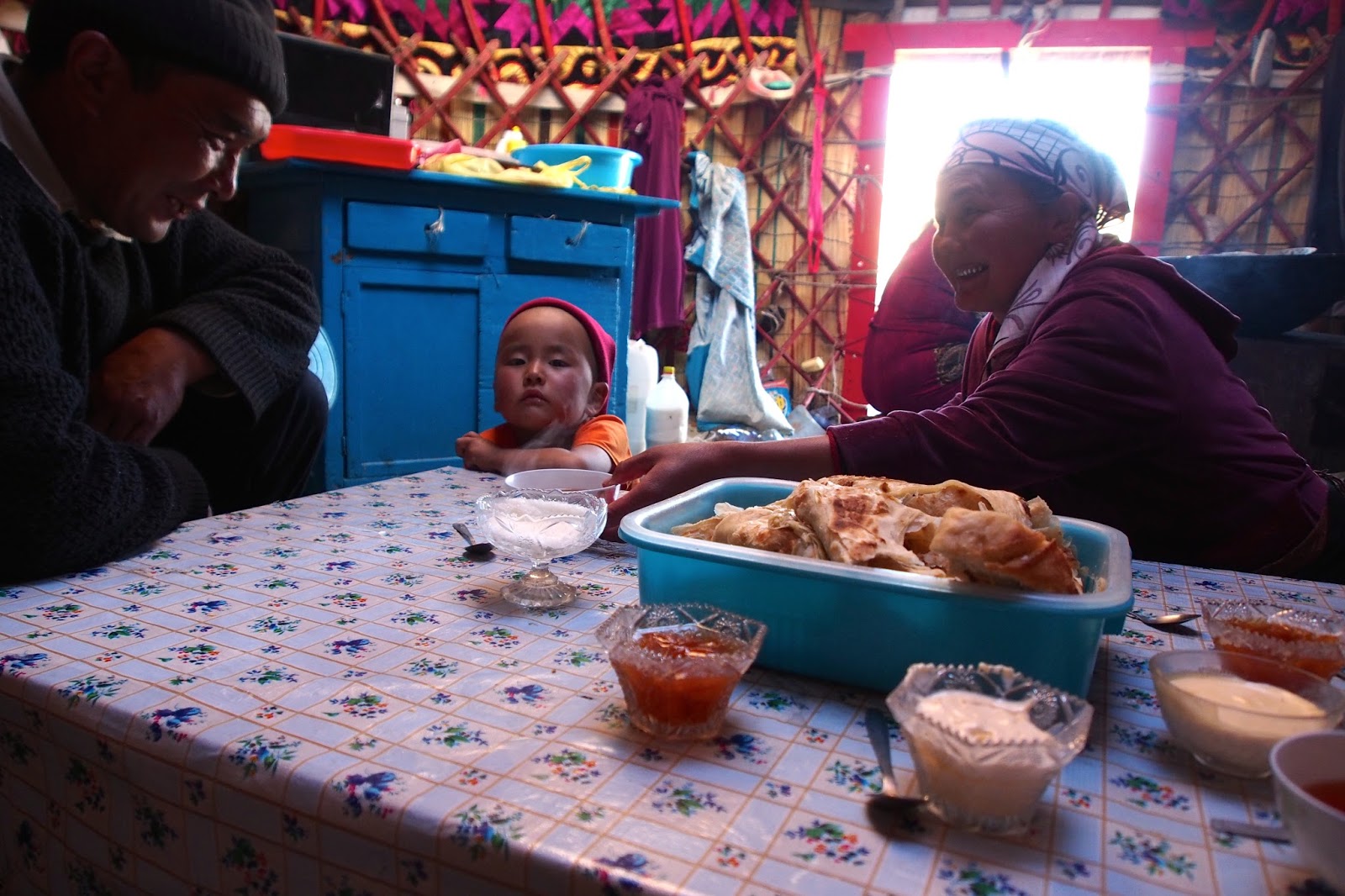 O půl 6. jsme dorazili k osamocené jurtě, která byla už víceméně skoro na úrovni jezera, akorát ještě tak 1-1,5 hod chůze daleko. Zastavil jsem se a zeptal se místních, jestli jdem správně do osady Jamanečky. Prý že jo, že támhle přímo směrem k jezeru. Když jsme tam tak stáli, tak jsem si říkal, že si tam můžem dát krátkou pauzu. A když pauzu, tak bychom těm místním mohli dát oplatky. Vybalil jsem je tedy a začal rozdávat všem okolo – otec, matka, bábuška a 3 děti. A oni že ať jdem na chvilku dovnitř do jurty. Bingo! Usadili nás u stolku a hned donesli chleba a marmeládu a kajmak (něco jako smetana). A čaj. A pak ještě kumys. Tak jsem ještě donesl svoji meruňku a strejda se trochu zdráhal, ale pak si se mnou dal. Dozvěděli jsme se, že jsou z Kočkoru a celé léto tráví tady – 3 měsíce. Povídali nám, kolik maj kterejch zvířat. Už přesně nevím, ale byly to velký počty – třeba 40 koní, pak nějaký krávy a ovce. Byli hrozně přátelští a pohostinní. Měli to tam hezký. Ale samozřejmě je to tvrdej život. Mimochodem, paní bylo 35 let, skoro jak Kami. Ale vypadala aspoň o 10 let starší.