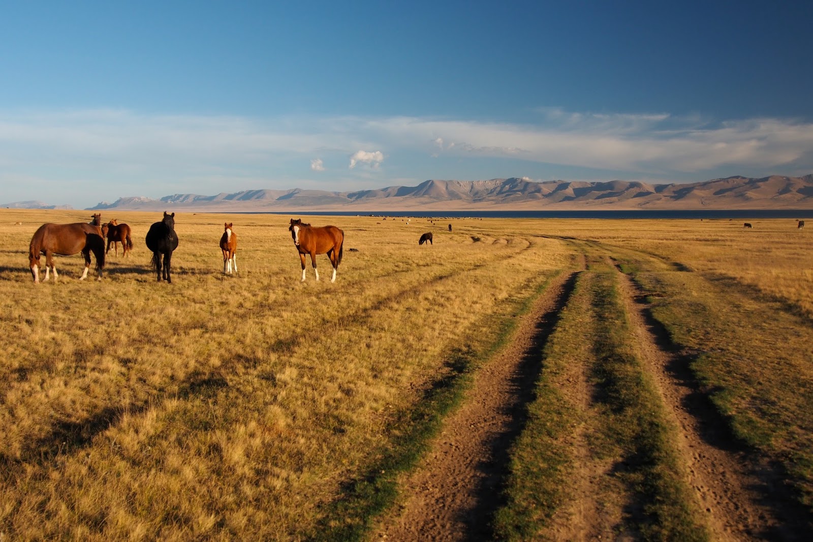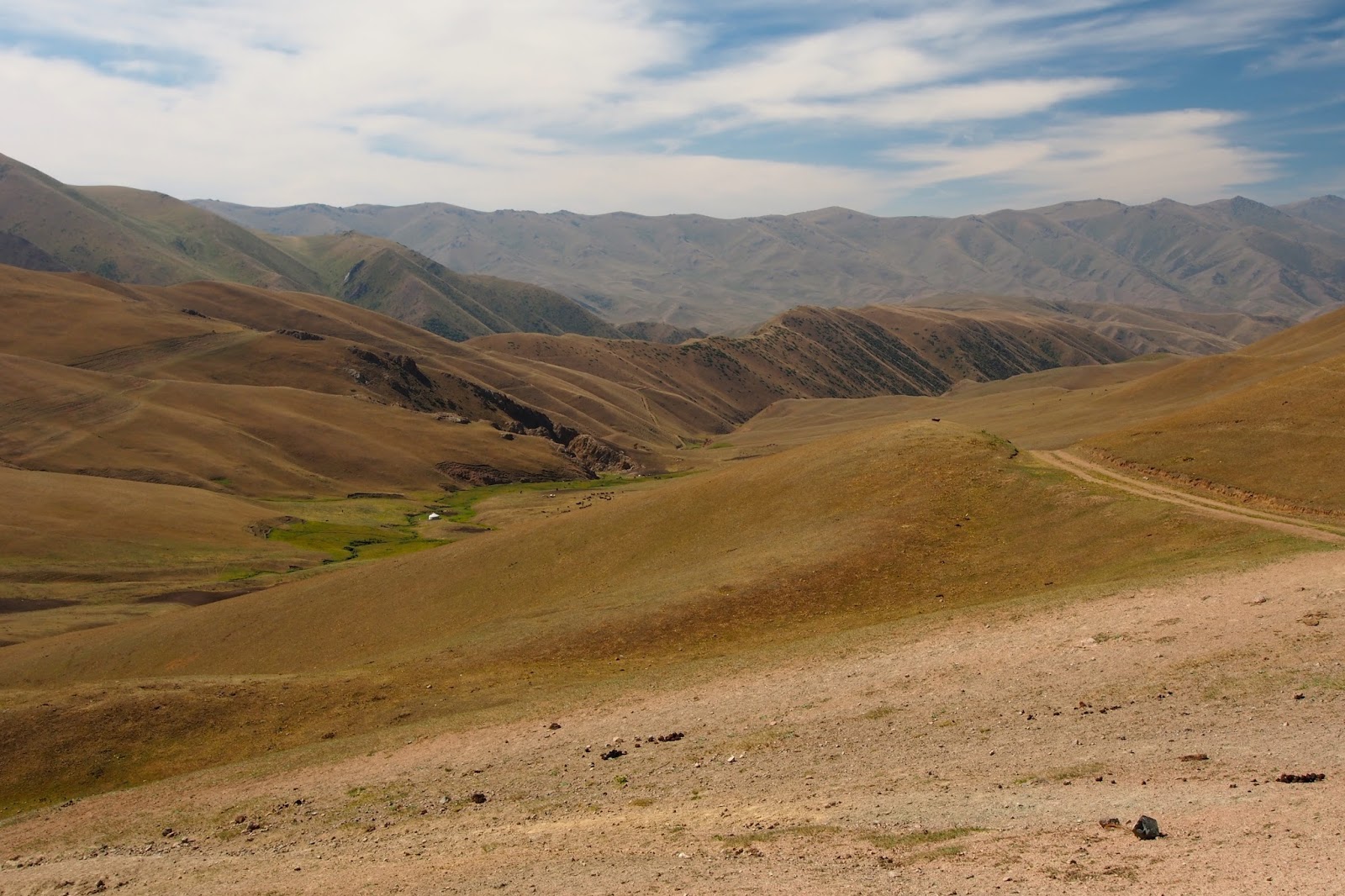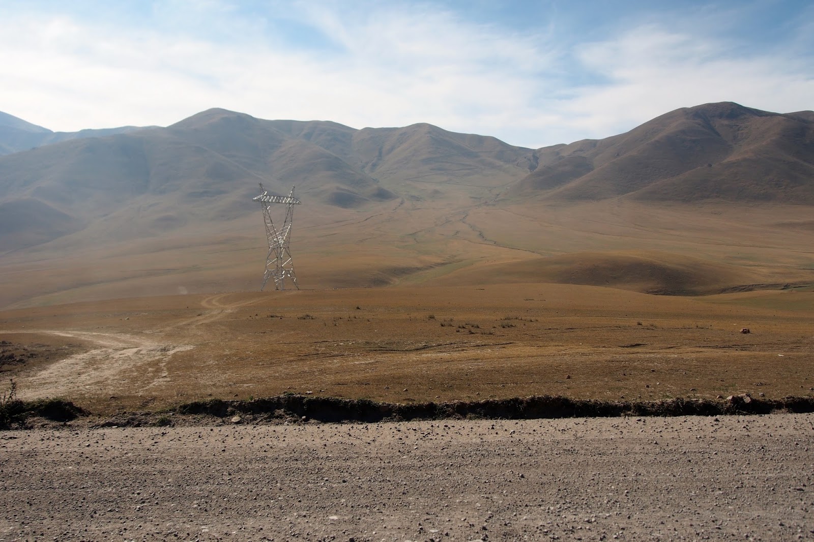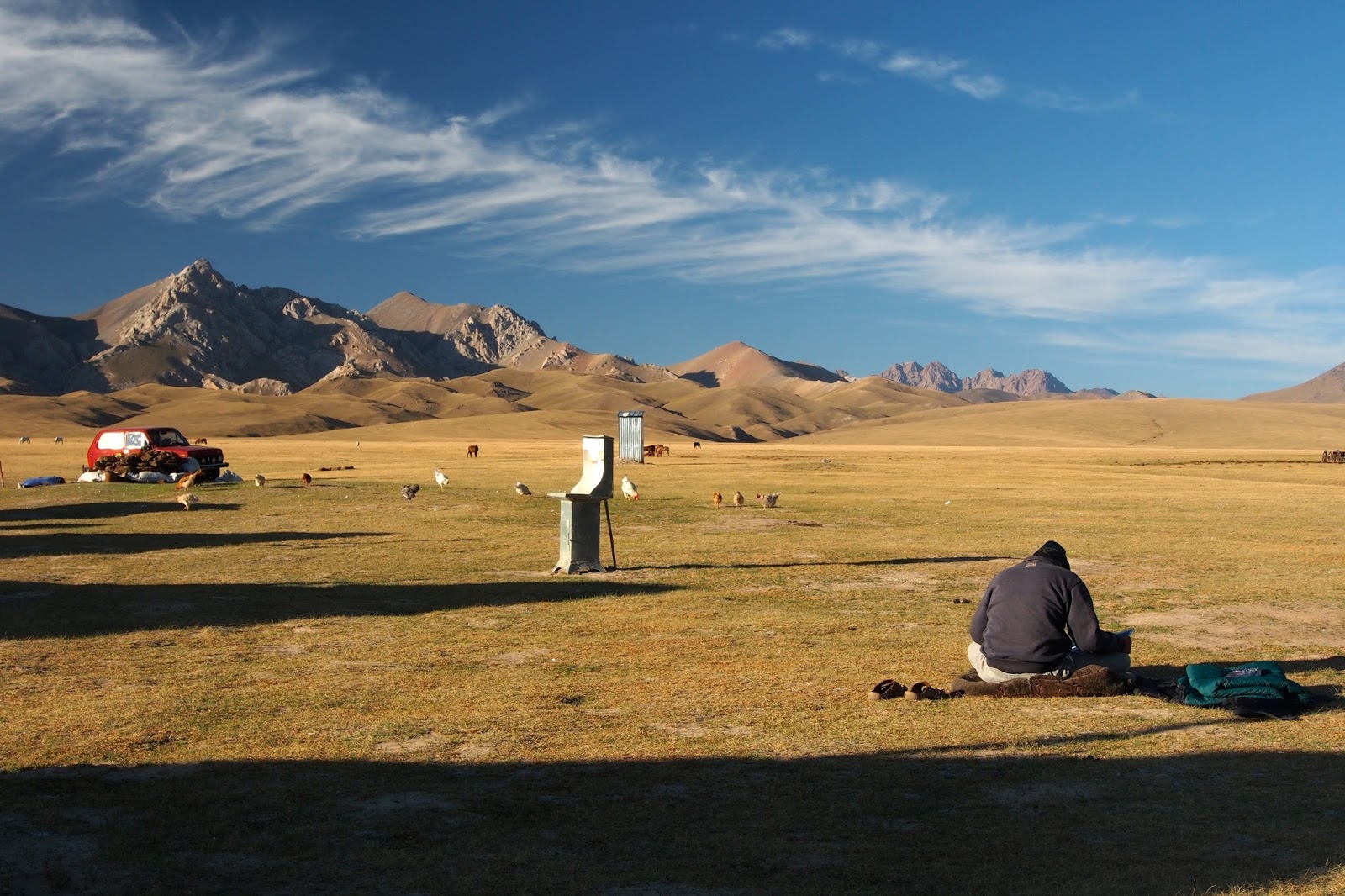 V úterý ráno jsme se v klidu najedli, zaplatili, sbalili se a vyrazili na silnici chytit nějakej spoj. Naším cílem byl Kočkor (a odtud pak k jezeru Song Kol). Veděli jsme, že nejspíš nepojede nic přímo a budeme muset přesedat v Balukči. Tak jsme si sedli na kraj silnice a čekali. Občas projela nějaká maršrutka, ale nikdo nám nechtěl zastavit. Čekali jsme tam snad hodinu a půl! Takže když nám konečně jeden mikrobus zastavil a vzal nás, ulevilo se nám. Navíc nás potěšilo, že jede přes Balukči až do Kočkoru.