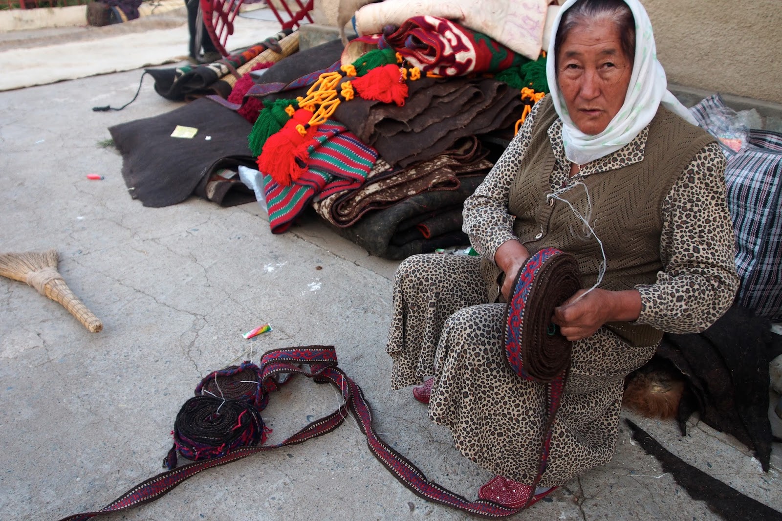 Paní, u které jsme byli ubytovaní, zrovna motá popruh, co se používá u jurty.