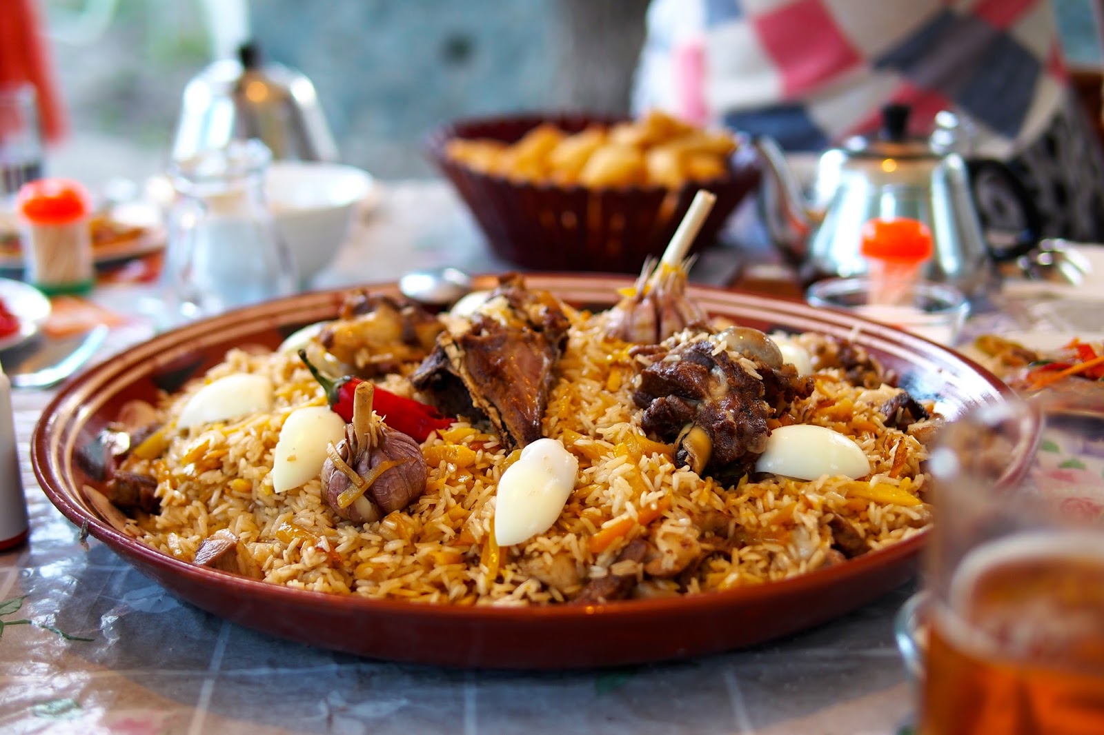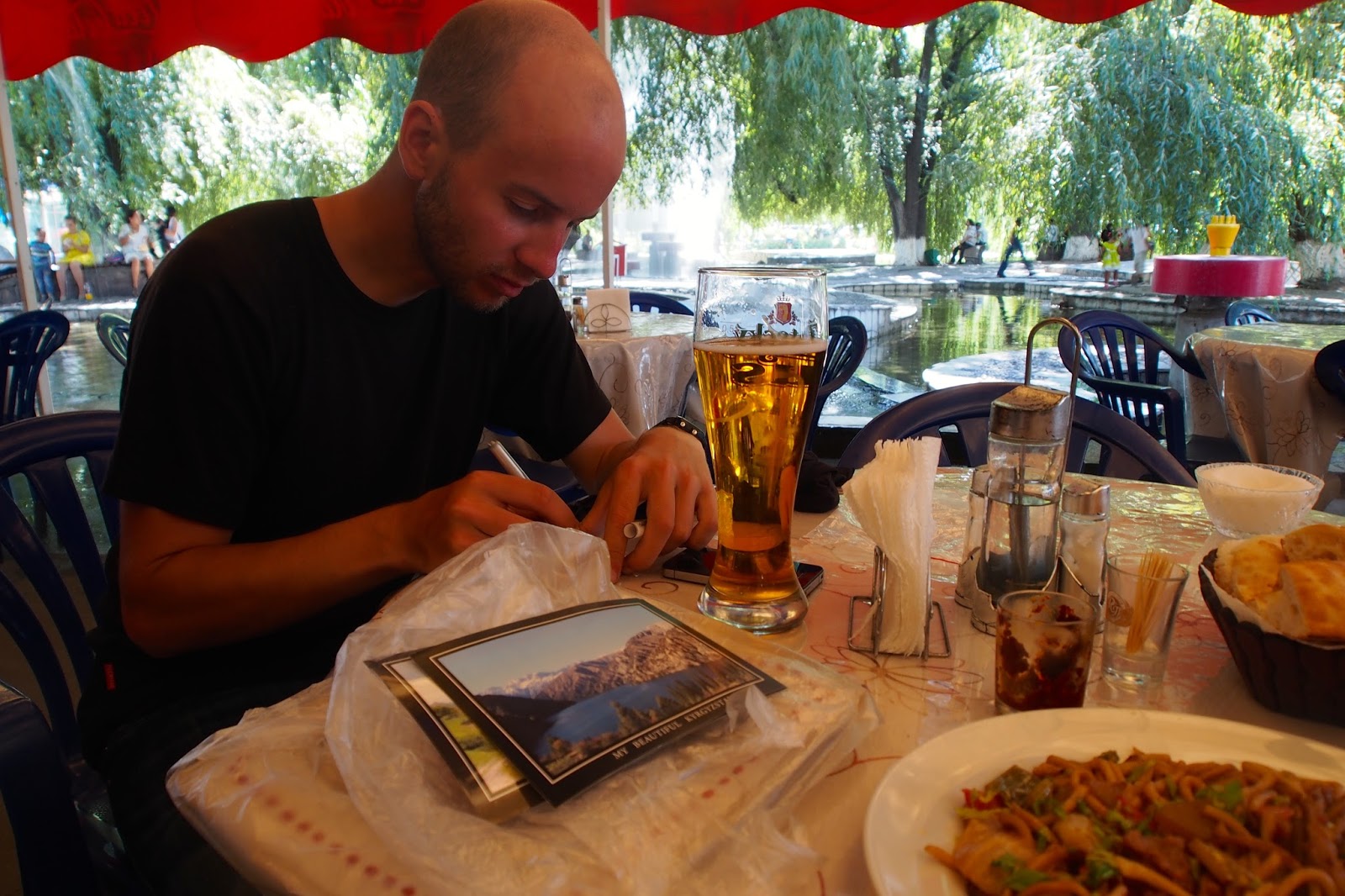 Restaurace to byla zajímavá – bylo to v kopečku a venku byly takový altánky, kde byl vždycky kulatej stůl a posezení dokola, kde se sedělo bos – bylo to nízký, spíš na turka nebo tak. Byl tam Bobek se ženou (syn byl ve městě se svými přáteli), pak Oleg s Maxem a pak ještě jeden jejich společný kamarád – Asan. K jídlu jsme měli prve 2 druhy salátů a pak přišel hlavní chod – plov – taková směs rýže s masem a zeleninou. Byl v tom i pečenej česnek. Bylo to hrozně dobrý!