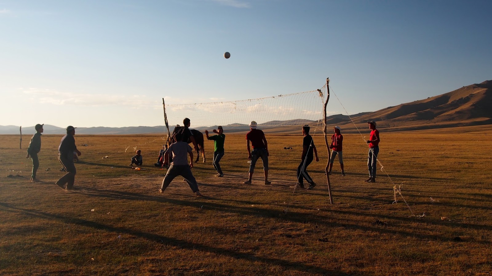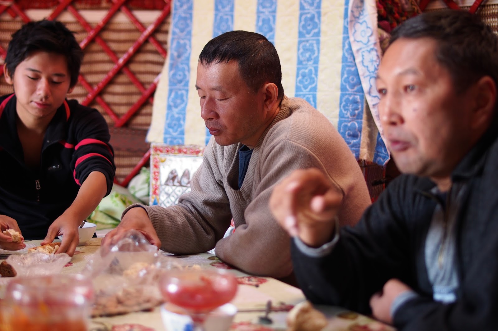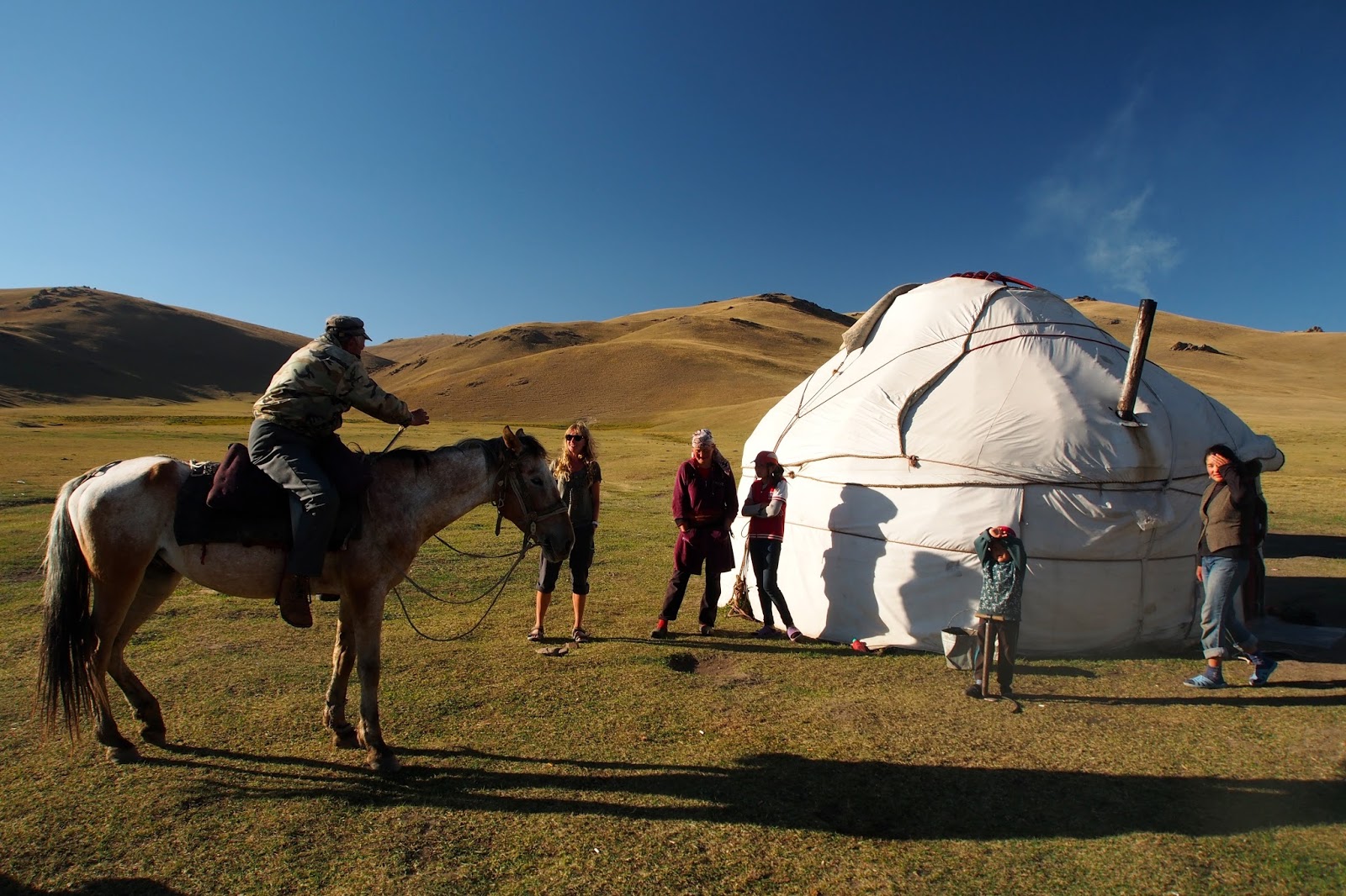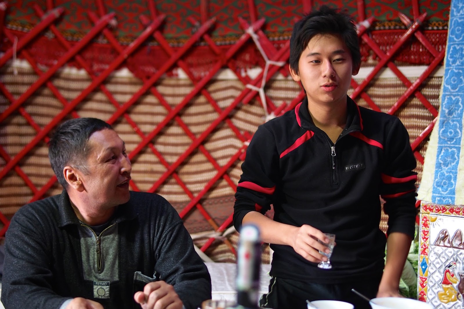 Pak si za náma přišel popovídat nějakej Švýcar, co byl v důchodu a žije v Thajsku a cestuje po světě a prý studuje dlouhověkost různých národů. Moc se mi nepozdával, přišel mi, že všechno ví, všechno zná. Potom přijeli noví hosté do vedlejší jurty – Bobek a Oleg a jejich synové Max a Dima. Abych to vysvětlil, Bobek je Kyrgyz, který kdysi dávno studoval v Tomsku na Sibiři a tam se tehdy kamarádil s Olegem, který je z Tomsku a taky tam studoval. Pak se asi 20 let neviděli, než se náhodně potkali v Kazachstánu. A od té doby jsou v kontaktu a navštěvují se. Teď je jim kolem padesátky. Přišli se s náma hned seznámit a pozvali nás na večeři na rybí polévku z místních ryb. To jsme samozřejmě nemohli odmítnout. Ještě před večeří si kluci pojezdili na koních. Na večeři kromě polívky byly i pečené ryby a vodka.