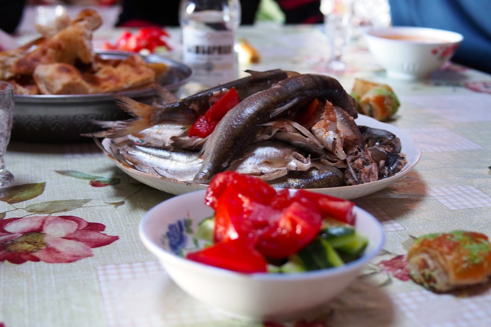 Když jsme měli pořešený informace, tak jsme šli na trh a do obchodu dokoupit nějaký dobrý jídlo, mimojiné čerstvý (kozí) sýr a rajčata, naše oblíbená kombinace s chlebem. Pak jsme u trhu zašli do takovýho bistra na jídlo. Bylo tam vedle sebe asi 5 fakticky totožných podniků, všechny nabízely zhruba 10 pokrmů, kterým vévodily pelmeně a manty (knedlíky). Většina jídel stála 50 som nebo podobně. Hlavní nápor hostů asi měli v době oběda a takhle k večeru jsme byli jedinými hosty a mohli jsme sledovat, jak připravují těsto i náplně do knedlíčků na další den.