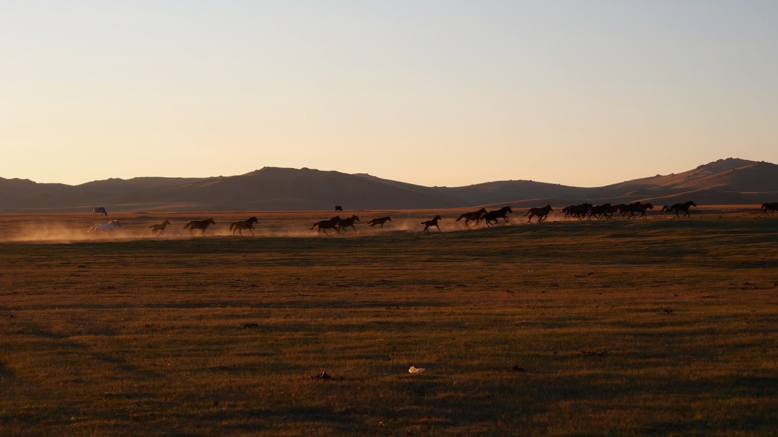 Když jsme vylezli ven z jurty a pomalu se chystali pokračovat v cestě, přijel na koni ještě jejich kamarád. Takovej srandovní strejda. Dal jsem mu ochutnat taky meruňku a dal si ještě repete. A pak se chtěl hrozně fotit s Kami. Rodinku jsme ještě podarovali pár drobnostma – zbytek kozího sýra, 2 čínský polívky, zbytek oplatek – a těsně před 6. jsme vyrazili dál. Míjeli jsme spoustu pasoucích se koní a krav a ovcí.