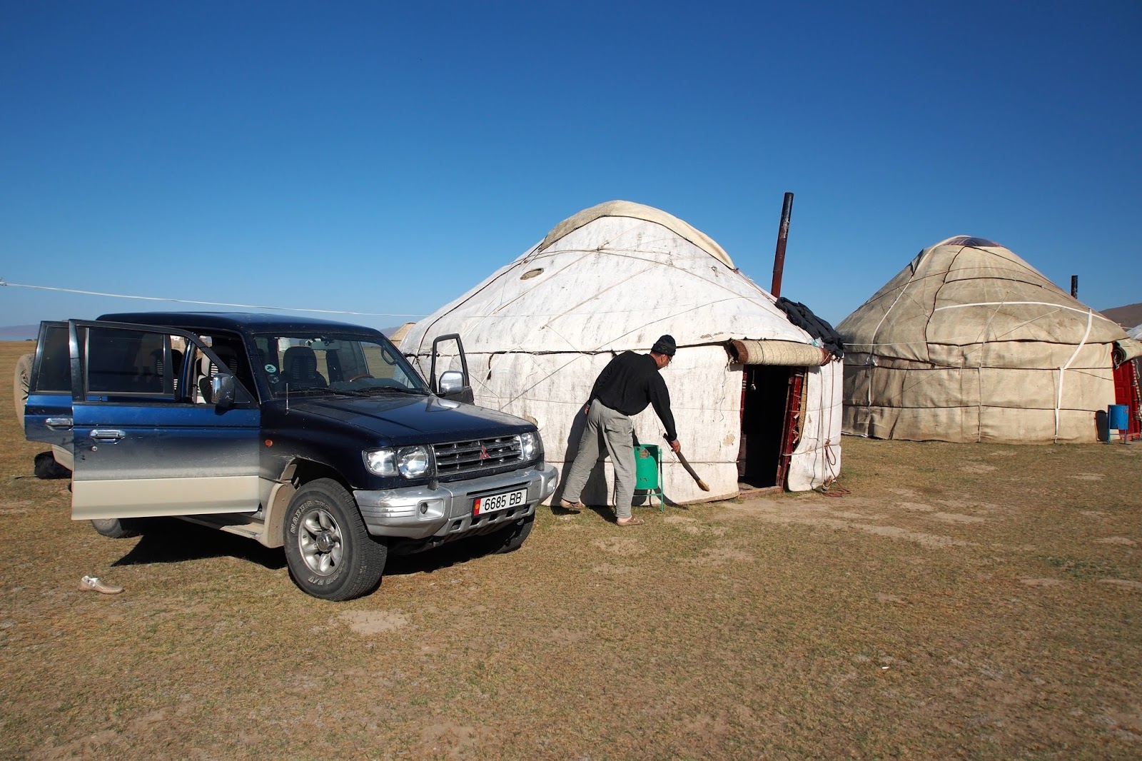 Některé jurty jsou určené k ubytování turistů. Jednu takovou jsme si vybrali. Není to úplně autentické – uvnitř jsou normální moderní matrace, aby to měl turista pohodlný. Prý že cena je 2000 som za jednu jurtu na noc. To nám přišlo jako fakt hodně. Tak jsem usmlouval 1500, aspoň něco. Vlastně to tím pádem bylo 750 som na osobu, včetně snídaně, což je podobná cena jak guest house v Karakolu.
