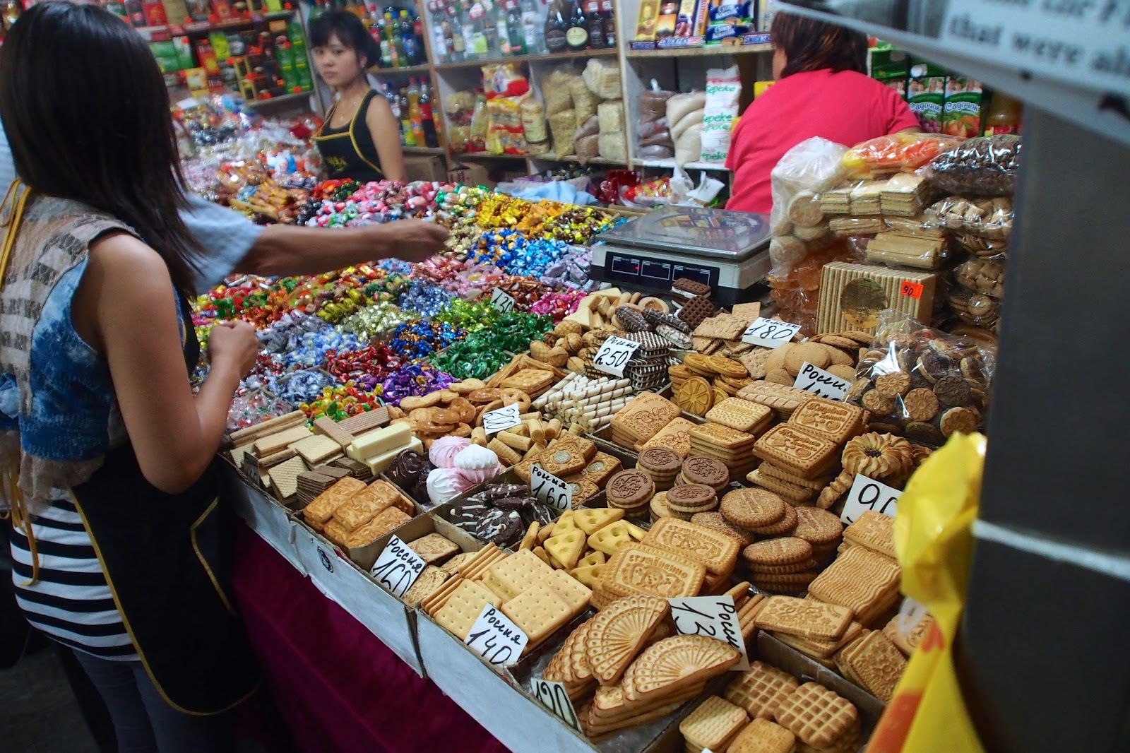 Tady prodávají sušenky na váhu – do je po Kyrgyzstánu všude. Je to fajn – skoro nic to nestojí a je to dobrý.