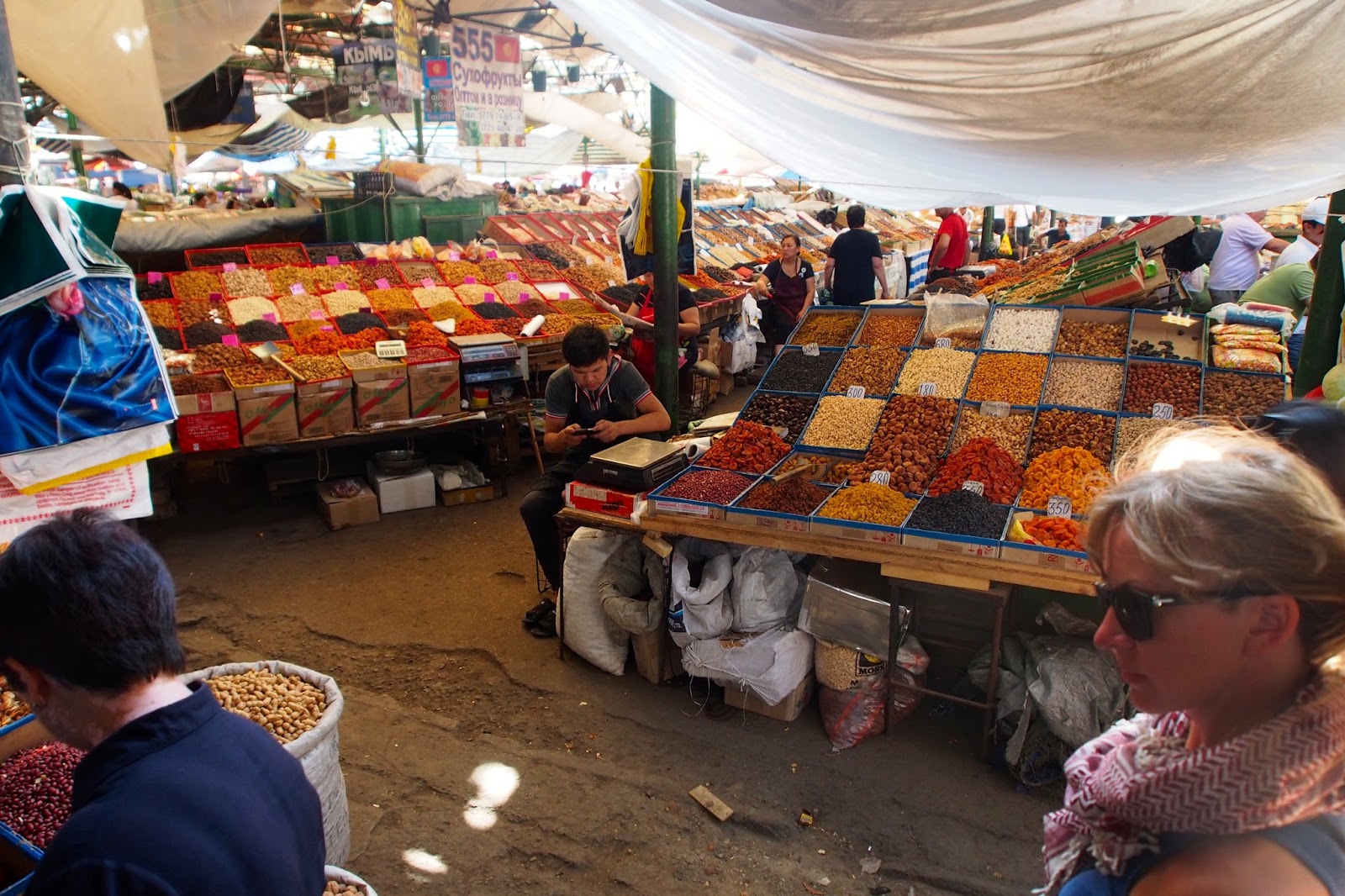 Ráno jsme nikam nespěchali. Vlastně jsme neměli žádný program – naší misí bylo sehnat pohledy a známky a jinak v podstatě nic. Ráno jsme trolejbusem (8 som) vyrazili na největší trh – Oš Bazaar. Původně jsem myslel, že bych třeba koupil nějaký dárky/suvenýry, ale nakonec z toho nic nebylo – to se mi stává na trhu často – že je tam hrozně moc věcí, ale já nakonec nevím, co bych si vlastně měl koupit. Ale baví mě to i tak, procházet ty uličky a zkoumat, co všechno tam mají.