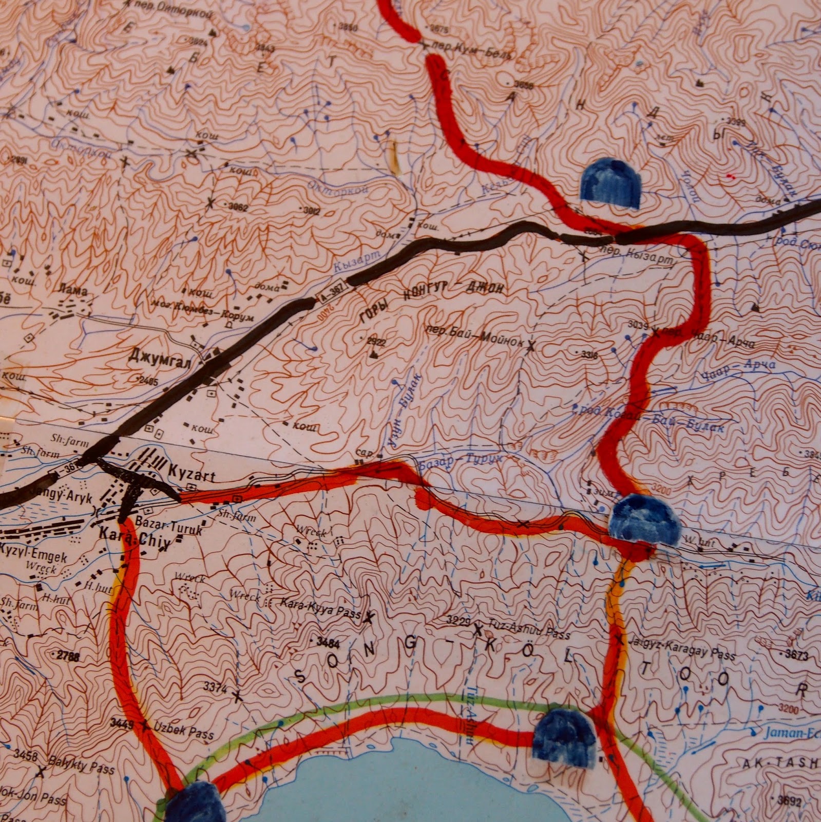 Rychle jsme se ubytovali a vydali se zpět do města – potřebovali jsme doplnit zásoby jídla na výlet k jezeru Song Kol a taky zjistit informace – jak se tam dostat, kolik to stojí a tak. Tak jsme se prve vrátili k tomu stánku, kde nám zařídili ubytování. Klasickej přístup k jezeru je autem přes jakýsi sedlo (jezero je ve výšce 3400 m, sedlo je asi 3800), ale jedna cesta tam a zpět autem stojí 3000 som (1400 Kč), tedy šíleně moc. A řidič prý rád počká u jezera s váma – 500 som za každý extra den. Jenže jakmile je člověk u jezera, tak tam je to rovina a už se tam moc toho nedá dělat. Tak jsem se ptal, jestli tam nejde dojít pěšky. Prý jo, autem k sedlu Kyzart a pak 2 dny pěšky. Hromadná doprava tam není. A kolik že bude stát auto? 1200 som nebo kolik. Hmm, to je taky docela dost. A že jako bez průvodce těžko. Mapu nemá. Tak jsem poděkoval a šel se zeptat o kus vedle do CBT (community based tourism). Tam jsem se dozvěděl, že se ke Kyzartu dá jet sdíleným taxi za 260 som/osoba. Akorát prý musíme ráno v 8 být na stanovišti sdílených taxi. Od toho, abychom šli sami, nás taky trochu odrazovali – první den se má jít 4 hodiny a to prý je ještě docela jasný, ale druhý ten 6 hodin a to už je horší. Seděla tam taková holka, co tvrdila, že tam šla před rokem a že několikrát zabloudili. Tak se ptám, jestli mají mapu. Mapy došly. Tak ok, vyfotím si mapu, co maj rozloženou na stole. OK. Nebudu vás napínat, místo dvou dnů jsme to ušli za jeden a ještě jsme došli o značnej kus dál, než se mělo dojít za ty 2 dny. Ale to trochu předbíhám.