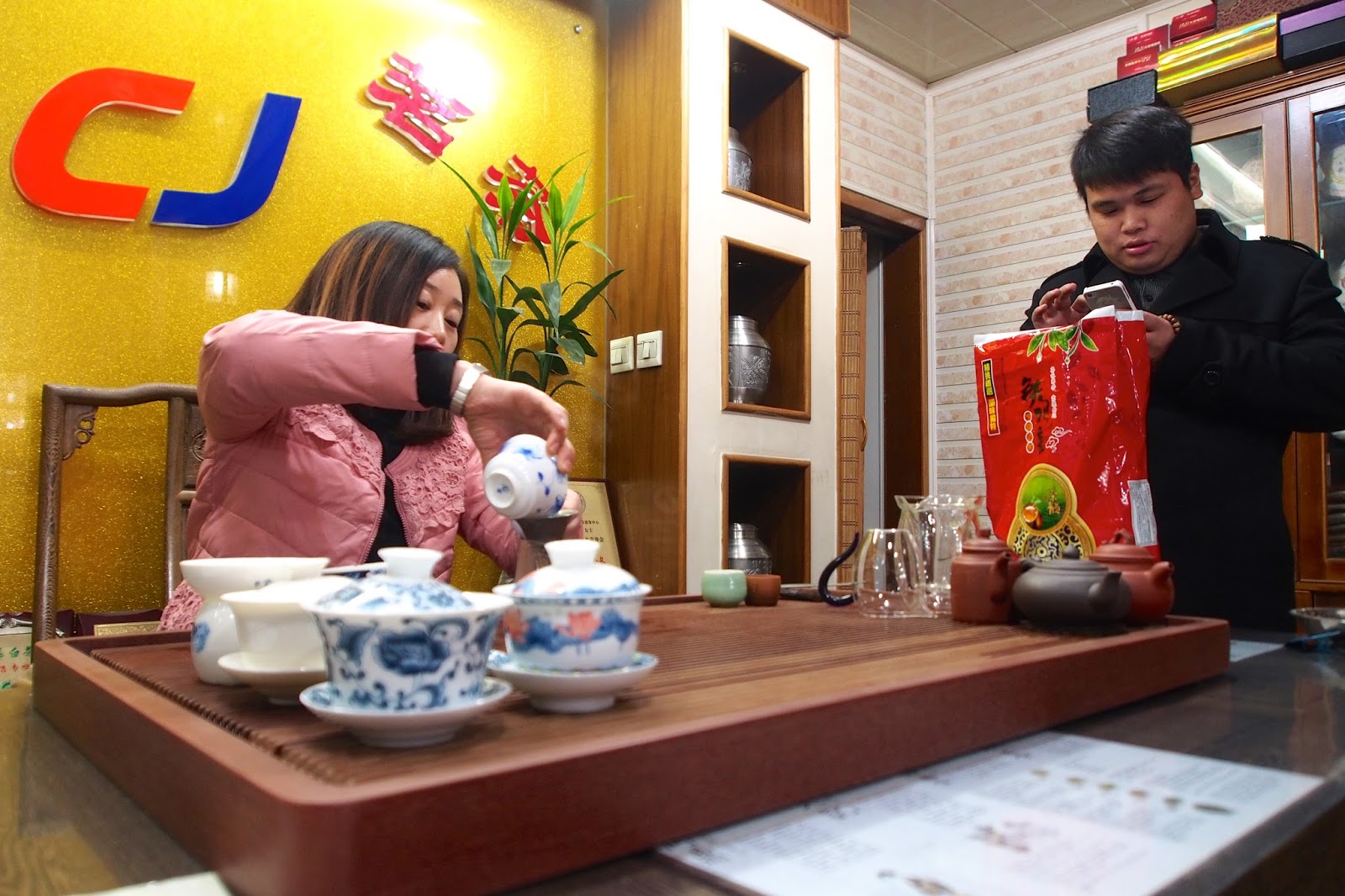 Měli vytištěný seznam čajů, kde bylo dohromady tak 30 čajů. Čínsky a anglicky. A pak mi borec napsal na papírek ceny jednotlivých čajů. Byly to pálky. První stál 260 juanů za 500 g (asi 1000 Kč), druhej 400, třetí 600. Pak jsem ještě zkoušel nějakej černej. O tomhle psychologickým efektu už bylo popsaných spousta knih – že když ti někdo prve něco dá zadarmo, tak pak je člověku zatěžko si nic nekoupit. No tak jsem si koupil 100 g toho nejlevnějšího a 50 g toho trochu dražšího. Samozřejmě jsem nemusel (a neměl) kupovat nic, ale nějak se mi nechtělo bojovat. Minimálně jsem měl smlouvat. Sranda byla, že když jsem vyšel ven, tak jsem zjistil, že su v ulici, kde je jeden takovej obchod vedle druhýho. Všechny podobný. Tak 20 obchodů minimálně. No, takže nákup čaje byl trochu fail. Přemýšlel jsem, kde se teda dá koupit v Pekingu čaj za rozumný ceny, rozuměj levný. Možná kdybych našel ten trh, jak jsem původně chtěl.