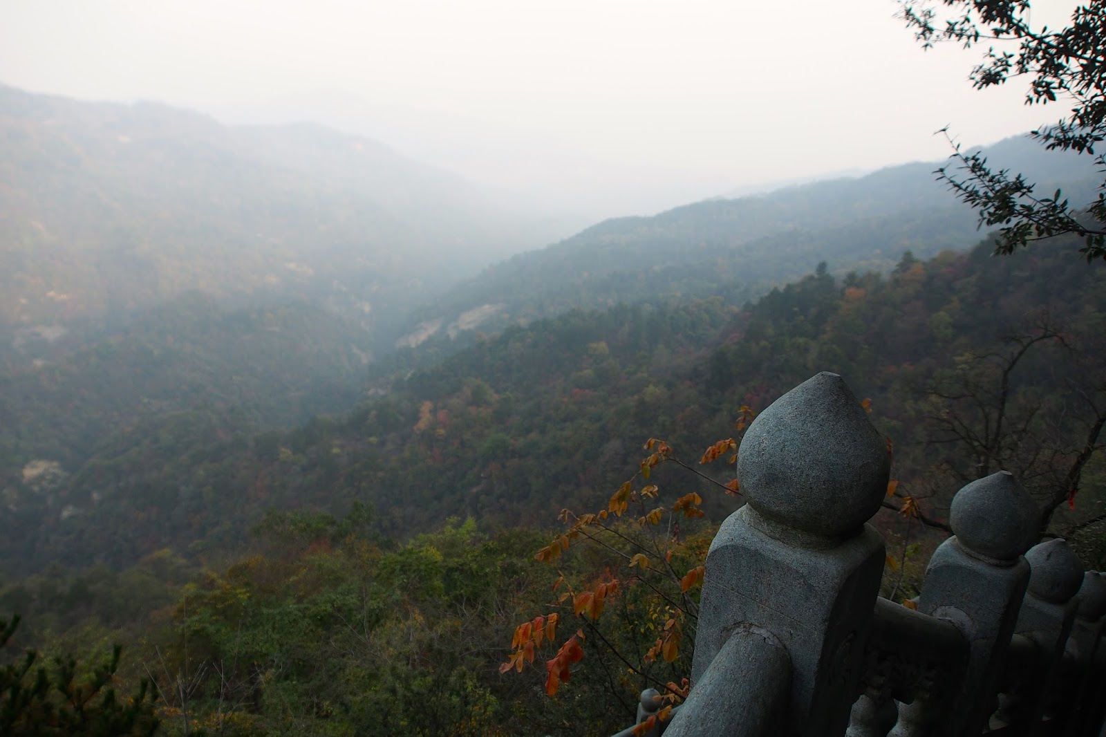 Za chvilku jsme vyšli na úplný vrchol. Byl tam takovej malinkej chrám a pár stánků. Hmm, jestli to vůbec mělo cenu sem lézt. Jako jo, asi by nám bylo líto, že jsme nebyli na vrcholu. Jenže obyčejně je tu jeden důvod, proč se vyplatí být na vrcholu – výhled. Tady ne. Už před lanovkou, jak jsme začali vycházet z lesa, se nám začaly odkrývat výhledy. Teda kdyby nebyl takovej smog. Teoreticky to mohla být jen mlha, ale podle mě to byl spíš smog, protože mlha by se nějak v průběhu dne vyvíjela, vzhledem k tomu, že někde v dálce trochu prosvítalo slunko.