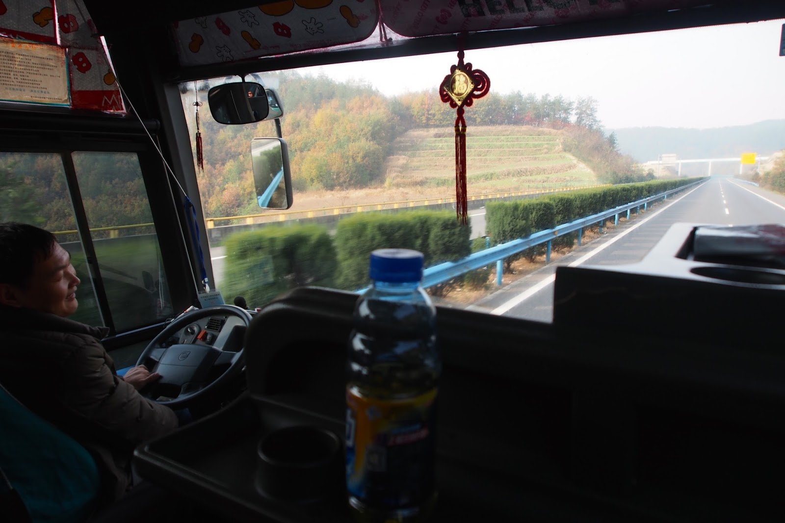 Vstávali jsme brzo – asi tak 6:30. V 7 už jsme jeli pickupem dolů do města na autobusovou stanici. Tam jsme dojeli tak 7:40 a lidí, co tam postávali okolo, jsme se zeptali na bus do Xi’anu. Nějakej borec nám ukázal, že je to tahle (zavřená) budka a ukázal nám ceduli na dveřích, že se má volat na tohle číslo. A prý že to zařídí. Pak někdo přišel s klíčem a otevřel. Zaplatili jsme a kupodivu pro nás přijel přímo velkej autobus s nápisem Mt. Wudang Express (po cestě tam nás poslední úsek vezlo jen auto).