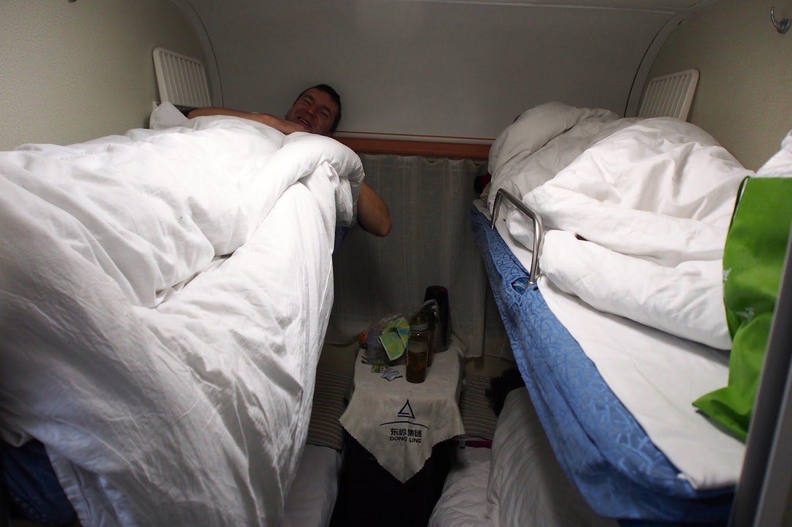 Měli jsme objednaný tzv. hard sleeper – v kupé měly být 2x 3 lůžka nad sebou s délkou 180 cm, což by znamelo, že si Jirka nenatáhne nohy. K našemu překvapení to vypadalo, že ve skutečnosti máme soft sleeper – délka byla 190 cm a v kupé byly jen 4 měkké postele. Jediné, čeho jsem se bál, byl děda v mojem kupé (měli jsme s Jirkou každý jiné kupé), který hned zkraje natahoval chrchle až z paty – Čínani jsou prasata a tohle rádi dělají. Představa, že to bude dělat celou noc, se mi moc nelíbila. Naštěstí mu to dlouho nevydrželo a pak už v klidu spal. A já taky.