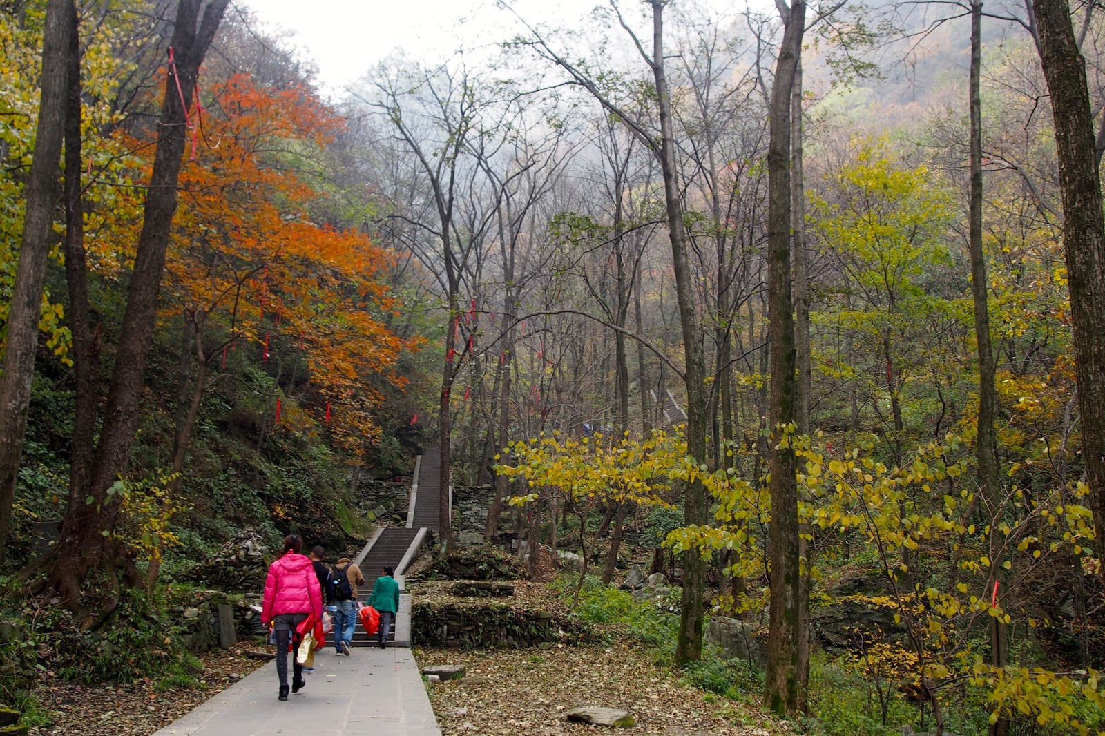 Za další půlhodinu jsme v cíli. Ale nám se to teda nezdálo – chtěli jsme až do hor a řidič nás vysadil na autobusovém stanovišti dole ve městě. Ale nic, nedá se nic dělat, dál už nás nevezme. Tak jsme teda vylezli z auta, rozloučili se a dál šli po svých. Došli jsme k bráně do národního parku. A jen jsme koukali – samý obchody, všechno nově postavený, turismus tady frčí. Došli jsme k informačnímu centru. Byla tam obří hala, kde se prodávaly lístky. Ale žádní lidi – jsme tu mimo sezónu. Zeptali jsme se, kolik to teda stojí. 240 juanů (asi 900 Kč). No tak to je teda pálka! A že v ceně jsou místní zelené autobusy, co jezdí nahoru do hor. Nahoře ve vesničce je spousta hotelů, kde se dá ubytovat. Prvotní šok z vysoké ceny následovalo smíření s tím, že tady prostě utratíme velký peníze. Však co, jsme na dovolené, tak se trochu rozšoupnem! Řekl jsem Jirkovi, že bych rád saunu a že když už, tak už, že si můžem za hotel trochu připlatit. Skutečnost nakonec byla trochu jiná (v Respektu by napsali složitější).