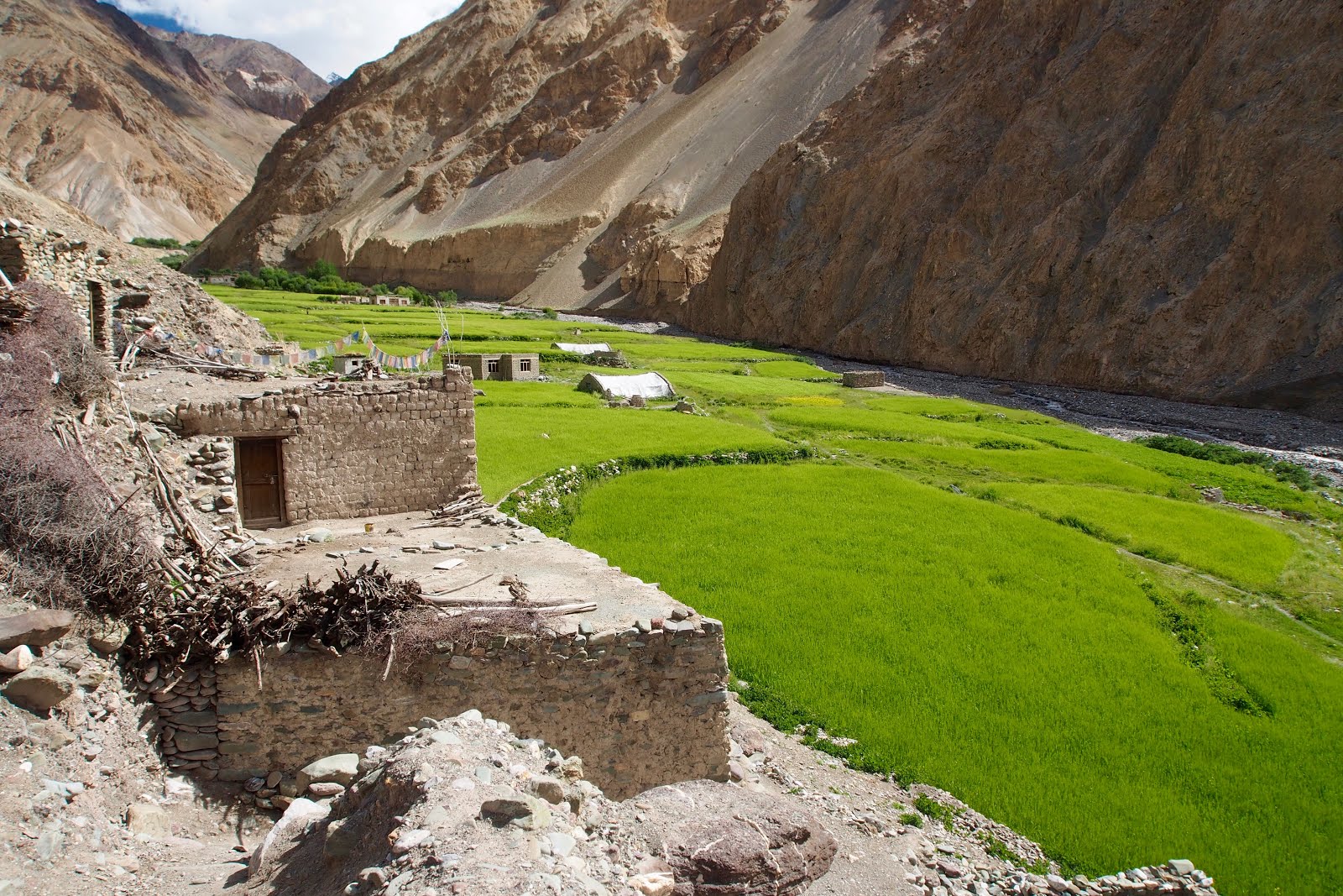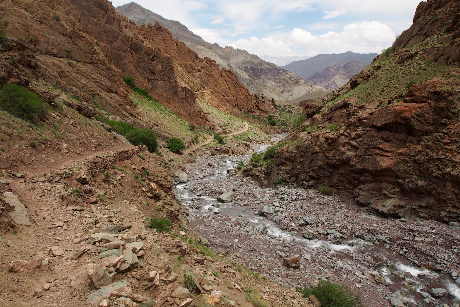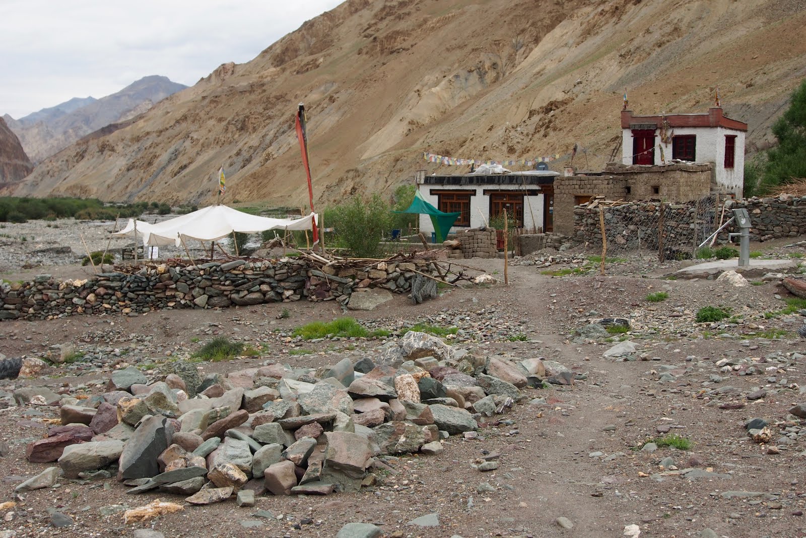 Jdu se projít ještě na malý vrcholek kus nad sedlem – o 100 m výš, tedy 5300 m. Pak začnu sestupovat. Začátek je docela snadný, ale pak se sejde k řece a je to celý takový hluboký a úzký, jako kaňon. A začne to být hodně obtížný. Místy se jde přímo v řečišti a občas se přeskočí řeka. Někde se vyleze nad řeku do svahu. Nemá to konce. Pak ají trochu zabloudím. Nakonec jsem ve vesničce, kam se dá dojet autem, za 6 h, tedy ve 14:30. Je tam takovej obchůdek pod stanem, tak tam čekám na Francouze. Snad se s nima budu moct svézt zpět do Lehu.