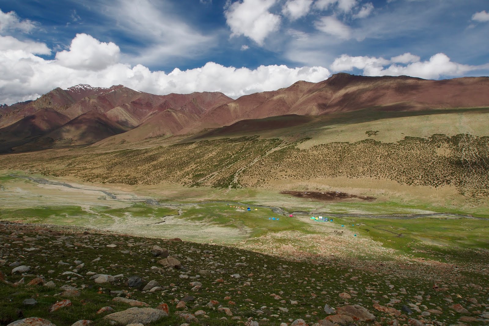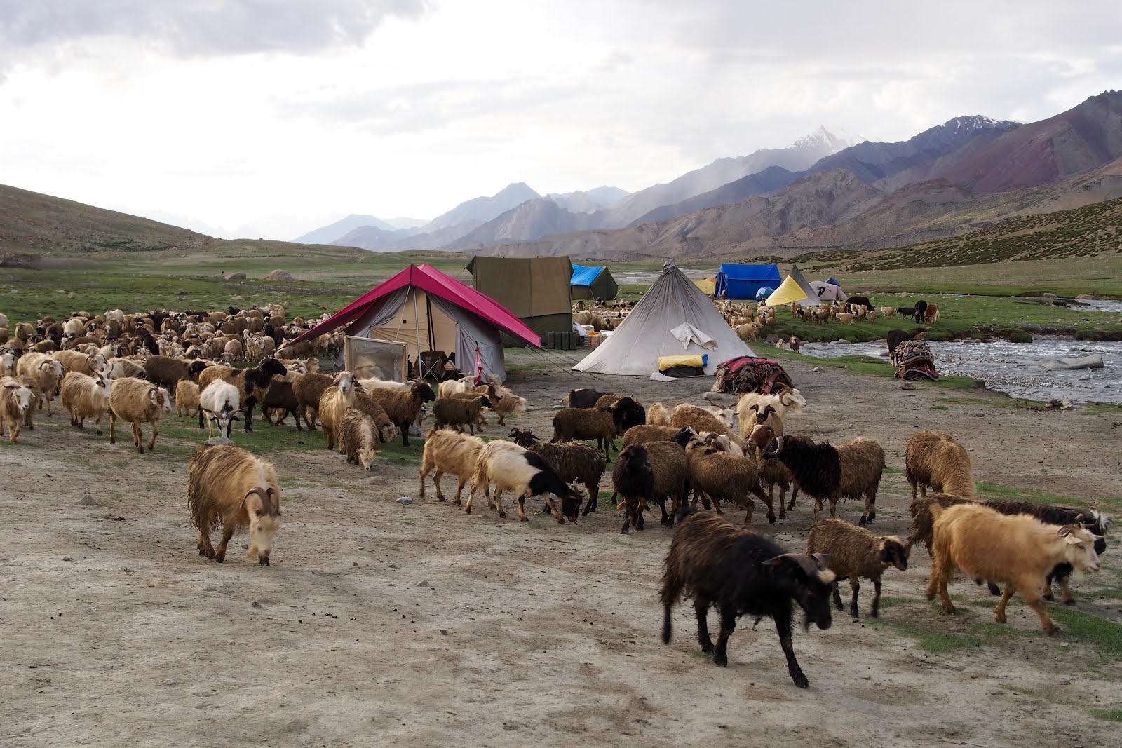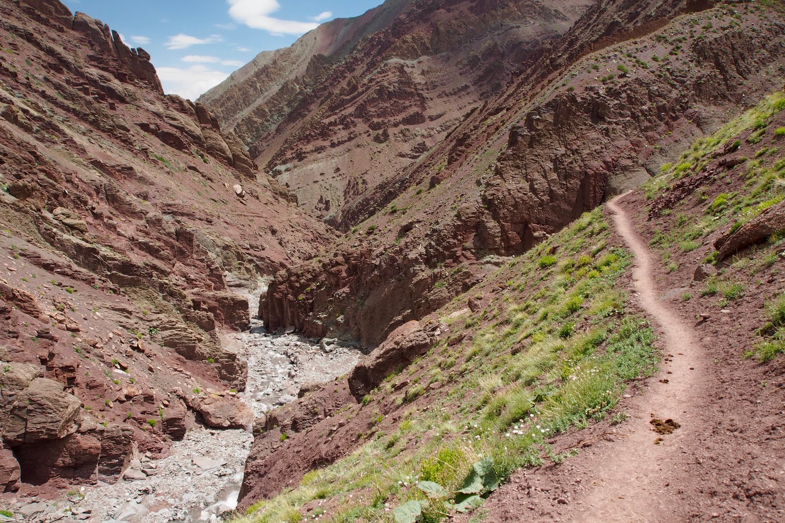 Jdu se projít ještě na malý vrcholek kus nad sedlem – o 100 m výš, tedy 5300 m. Pak začnu sestupovat. Začátek je docela snadný, ale pak se sejde k řece a je to celý takový hluboký a úzký, jako kaňon. A začne to být hodně obtížný. Místy se jde přímo v řečišti a občas se přeskočí řeka. Někde se vyleze nad řeku do svahu. Nemá to konce. Pak ají trochu zabloudím. Nakonec jsem ve vesničce, kam se dá dojet autem, za 6 h, tedy ve 14:30. Je tam takovej obchůdek pod stanem, tak tam čekám na Francouze. Snad se s nima budu moct svézt zpět do Lehu.