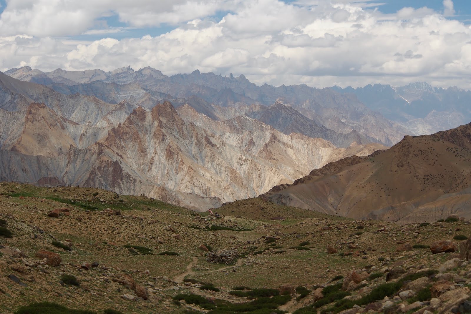 Pohled zpět kousek před sedlem. Zhruba uprostřed je vidět stan z předchozí fotky