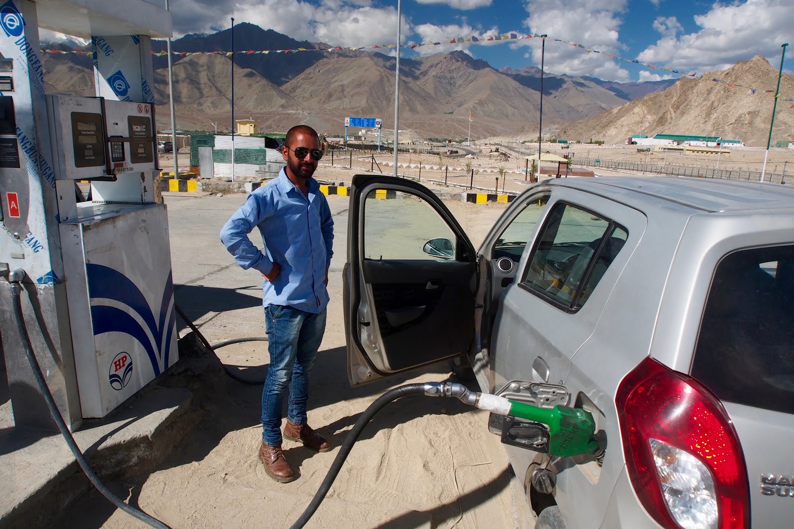 Přijdou asi za 1 hod. Stenzin si dává nudle. Prý se musím zeptat jeho šéfa, jestli mě vezme – už tam čeká. Takovej frajírek. Rifle s dírama, fešácký kožený mokasíny, delší černý vlasy, sluneční brýle, cigáro visí z pusy. Má hodně rozhrkanej Suzuki Samurai. Zeptám se ho, jestli mě vezmou. Prý že to není moc silný auto. Nakonec teda že pokud ostatním to nevadí, tak ok. Ještě že tak.