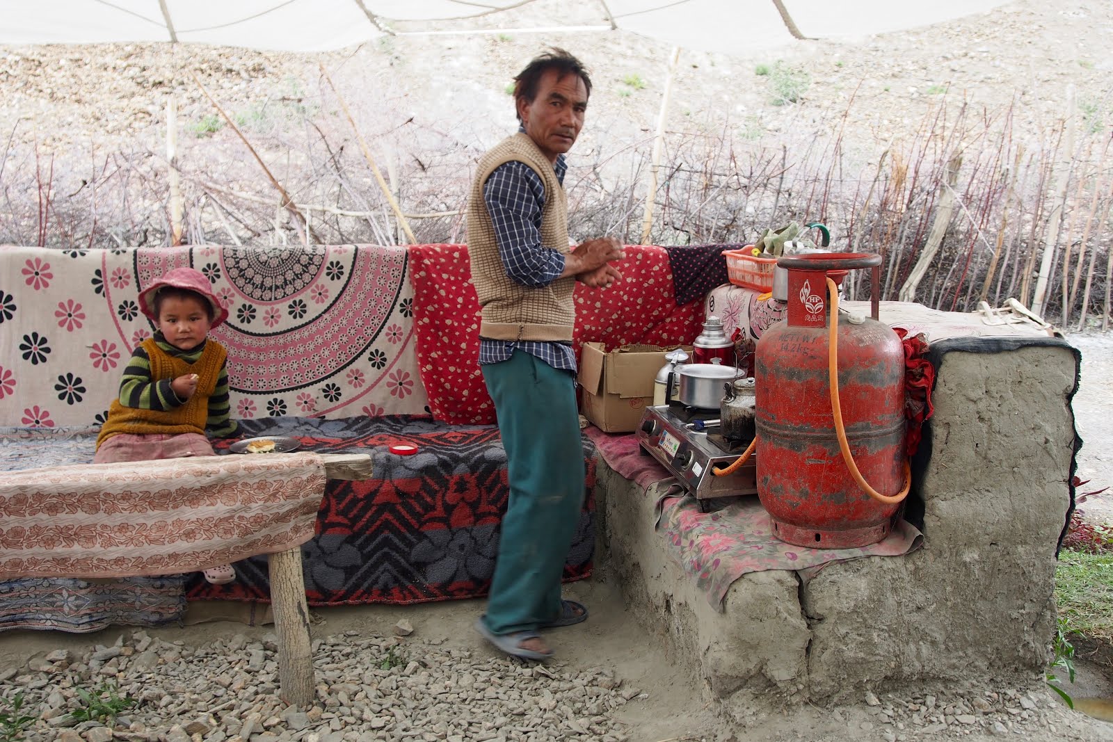 Oni pokračovali do Lower Campu (poslední tea tent před sedlem Kanda-la) na jídlo, já jsem zůstal a dal si obědovou pauzu (měl jsem chleba se sýrem a rajčatama).