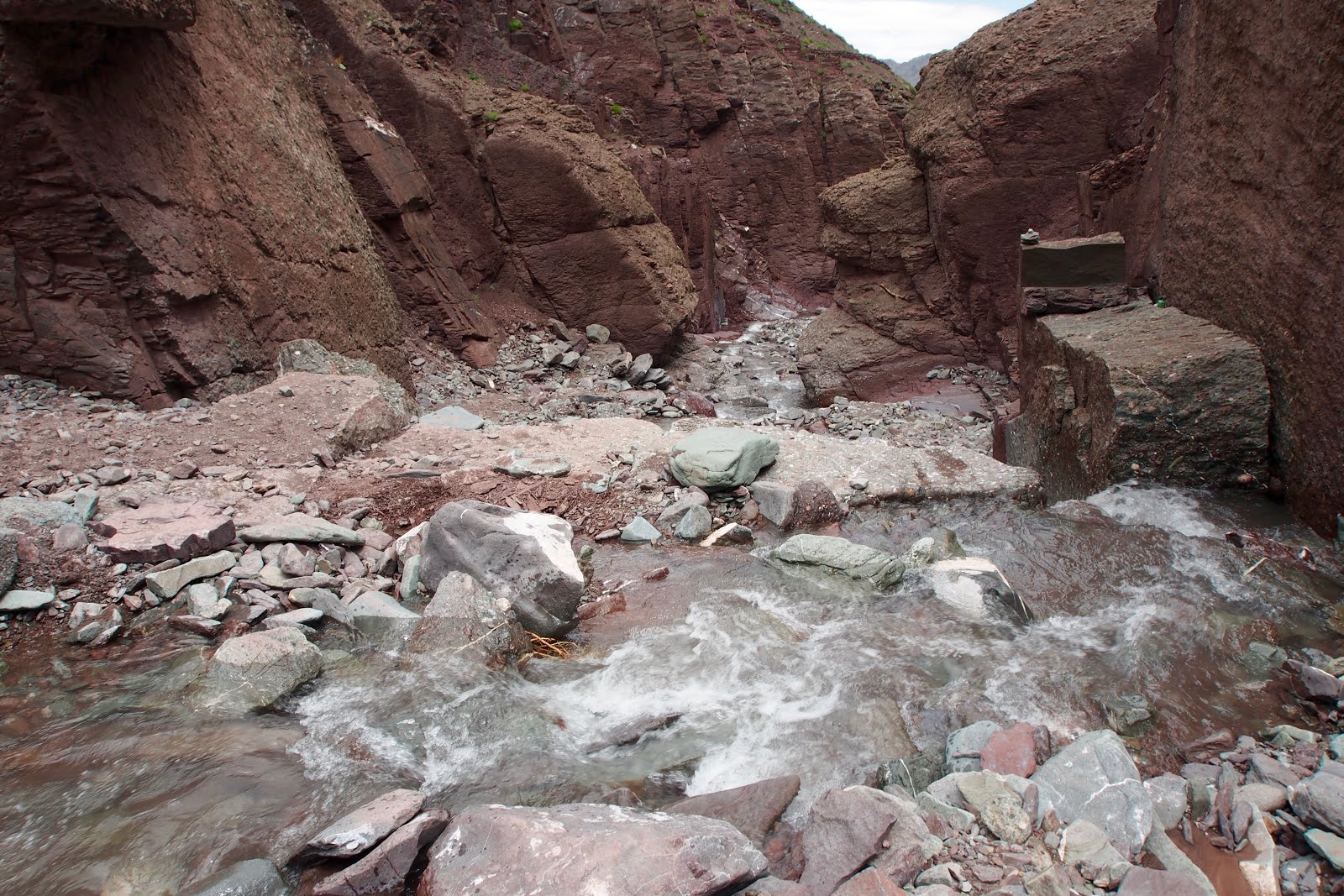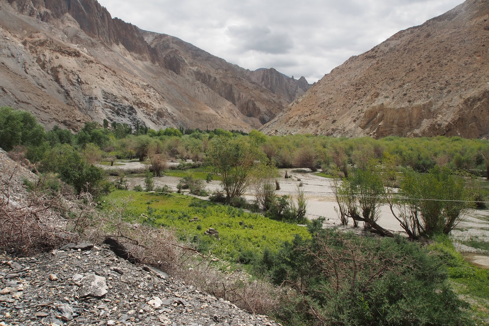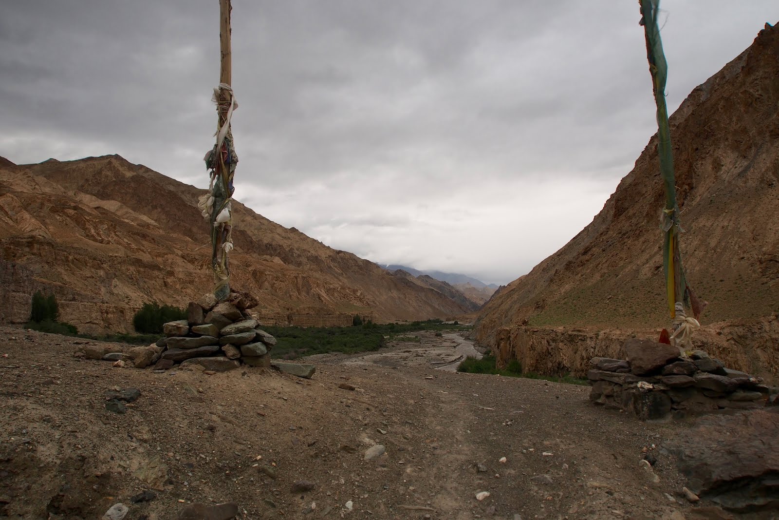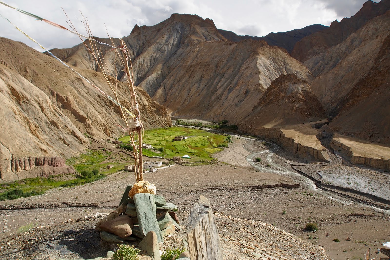 Jdu se projít ještě na malý vrcholek kus nad sedlem – o 100 m výš, tedy 5300 m. Pak začnu sestupovat. Začátek je docela snadný, ale pak se sejde k řece a je to celý takový hluboký a úzký, jako kaňon. A začne to být hodně obtížný. Místy se jde přímo v řečišti a občas se přeskočí řeka. Někde se vyleze nad řeku do svahu. Nemá to konce. Pak ají trochu zabloudím. Nakonec jsem ve vesničce, kam se dá dojet autem, za 6 h, tedy ve 14:30. Je tam takovej obchůdek pod stanem, tak tam čekám na Francouze. Snad se s nima budu moct svézt zpět do Lehu.