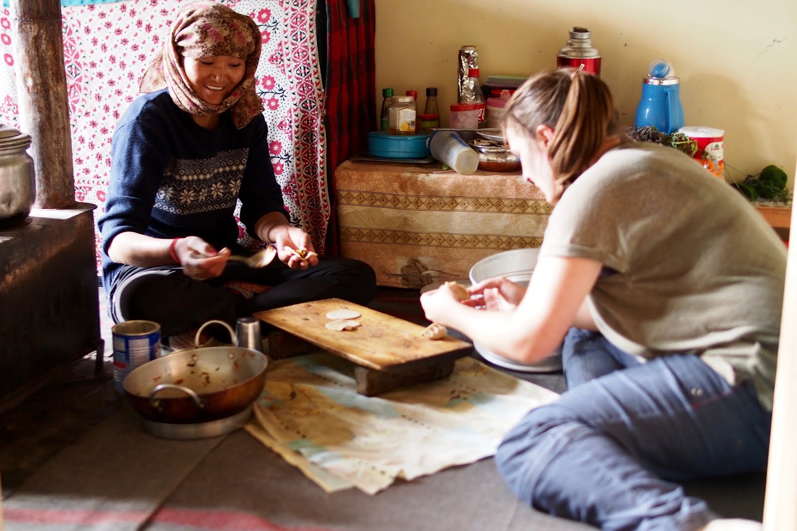 V Šinzu lezu hned do prvního „homestay“ a tam už se připravuje večeře (momo) za pomoci 2 hostů – francouzského páru – Anne a Antoine. Antoine je veterinář, specialista na kravský kopyta (taky jsem netušil, že něco takovýho existuje). Příjemně jsme si popovídali.