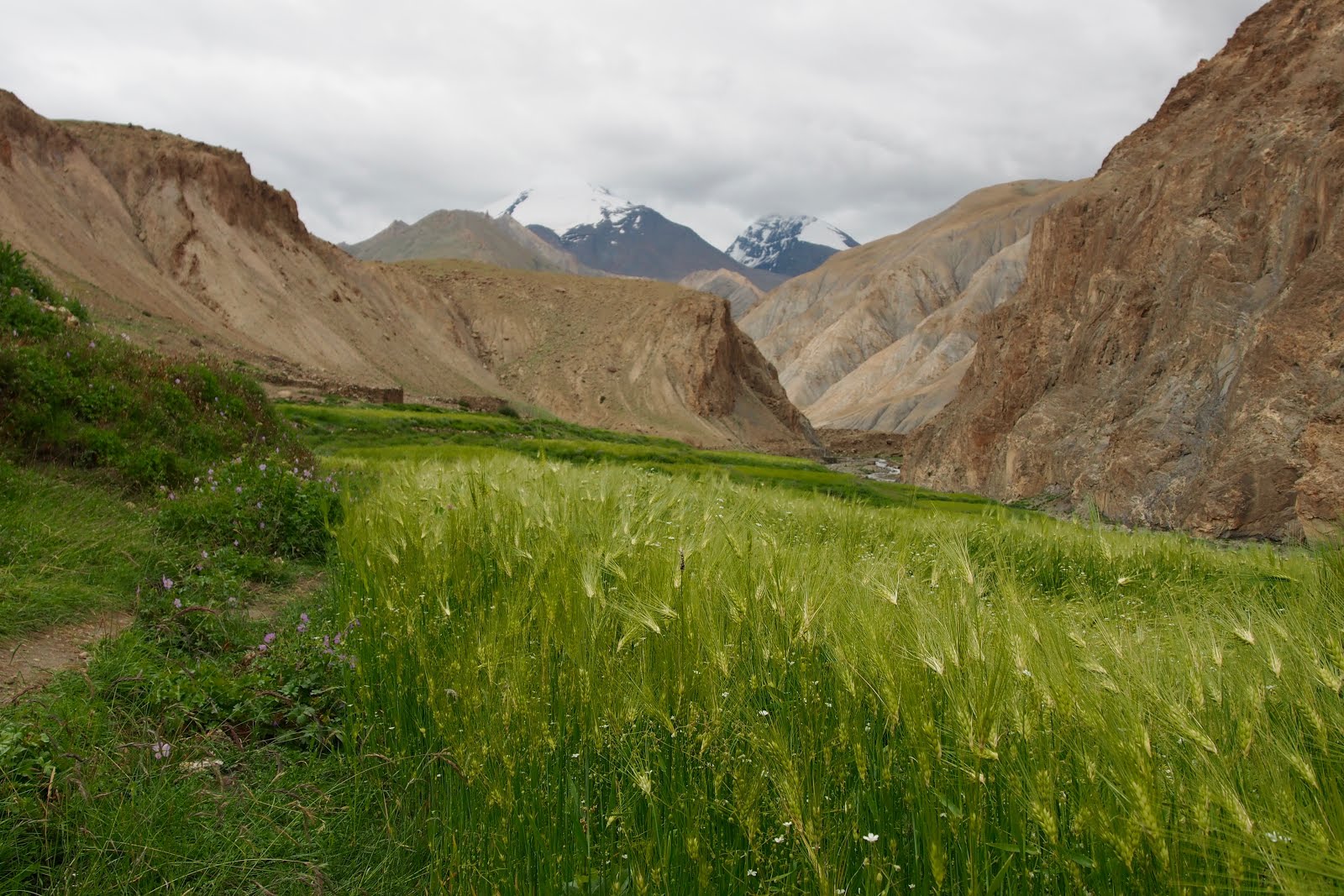 Vyrazím asi 8:40. Hned za vesnicí to prve zkusím spodem kolem řeky, ale brzo narazím na konec – musel bych brodit. Tak se vrátím a jdu vrchem – ztráta 10 min. Ve vrchní části Hankaru doplňuju vodu a zeptám se na cestu a dobře dělám – už jsem skoro chtěl jít blbě – doleva.