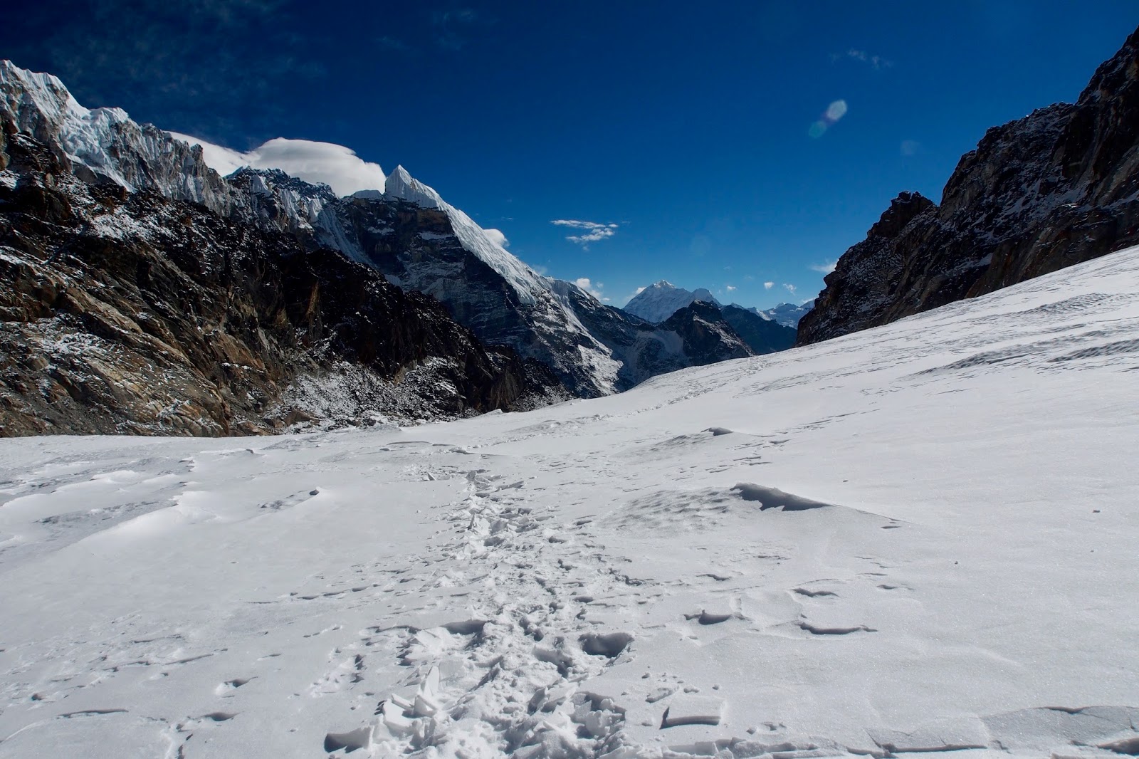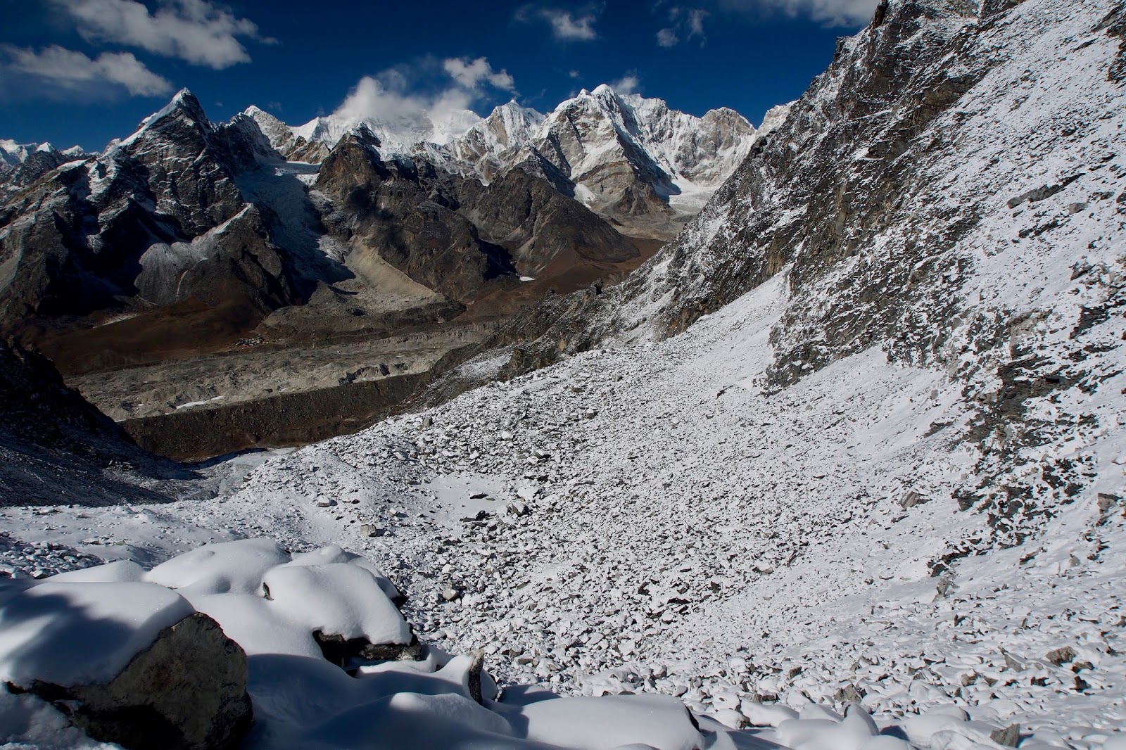 Pohled ze sedla na západ – sem mířím. Dole se musí přejít ledovec Khumbu.
