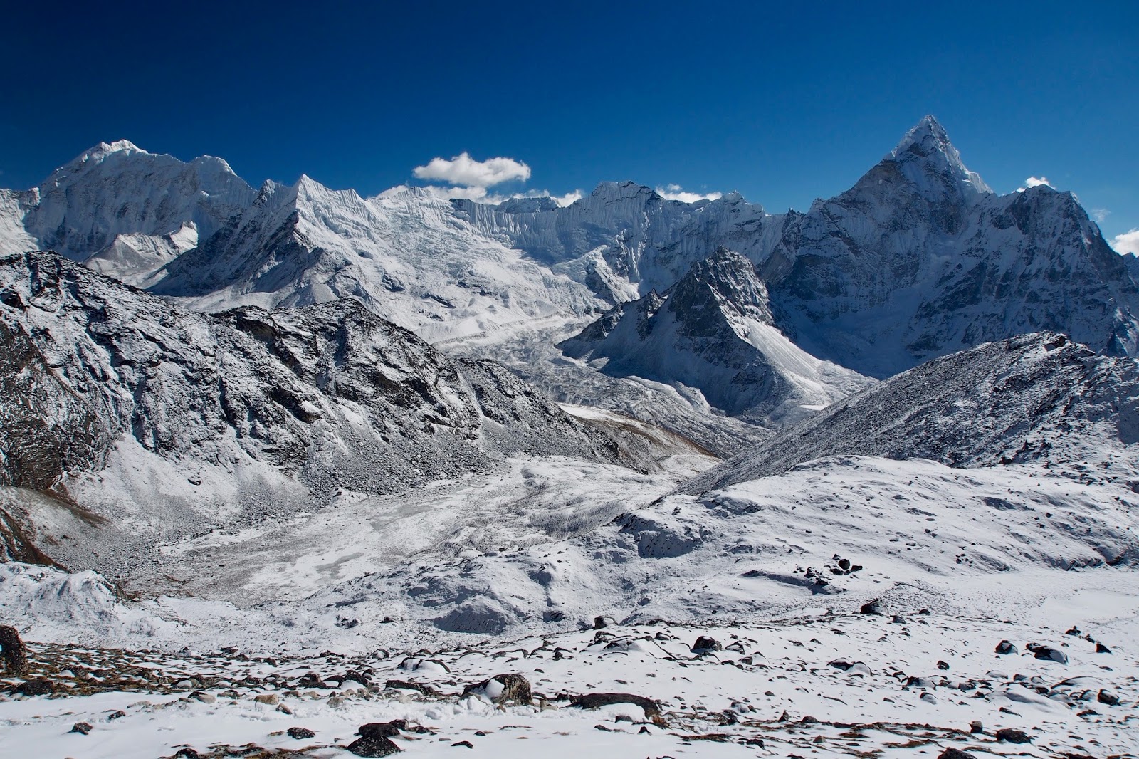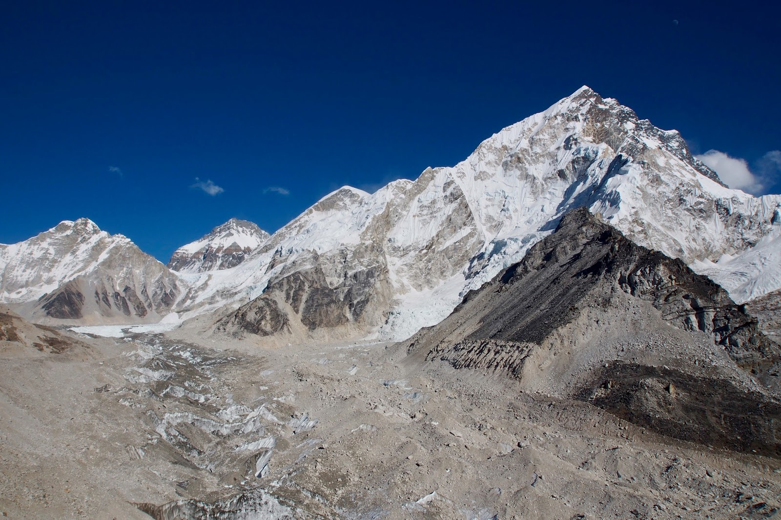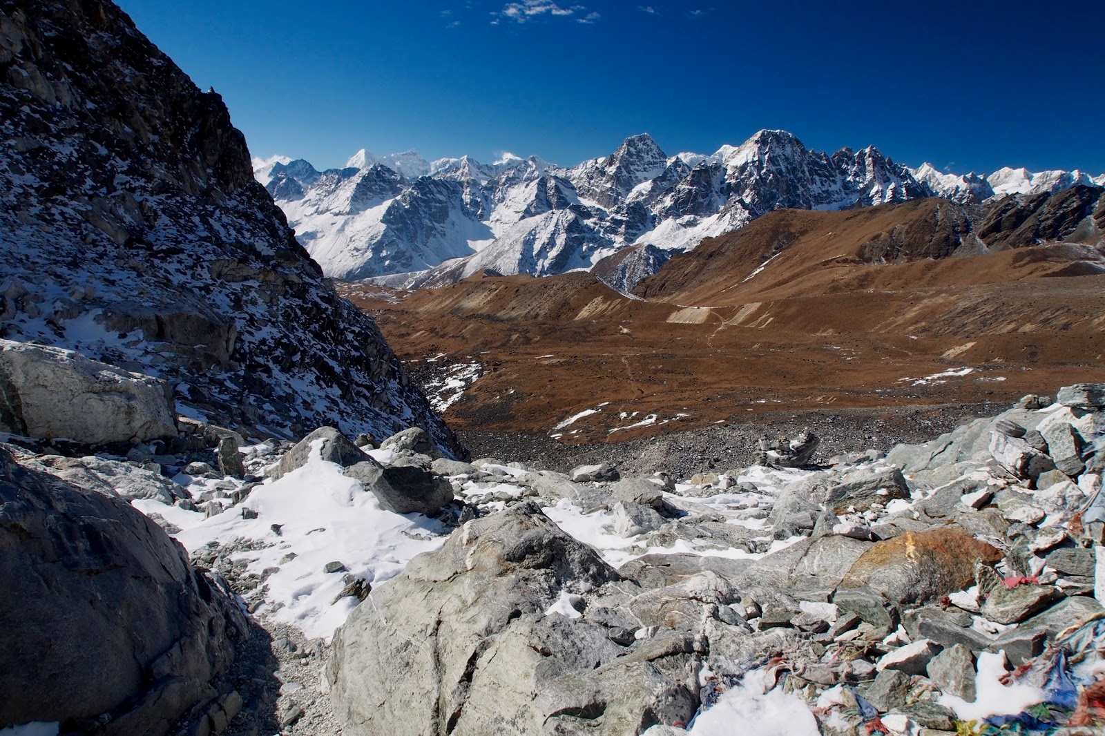 Pohled směrem k Everestu. Ten je ovšem skrytý za bližšími horami. Nejvyšší hora vpravo je pravděpodobně Nuptse (7861 m).