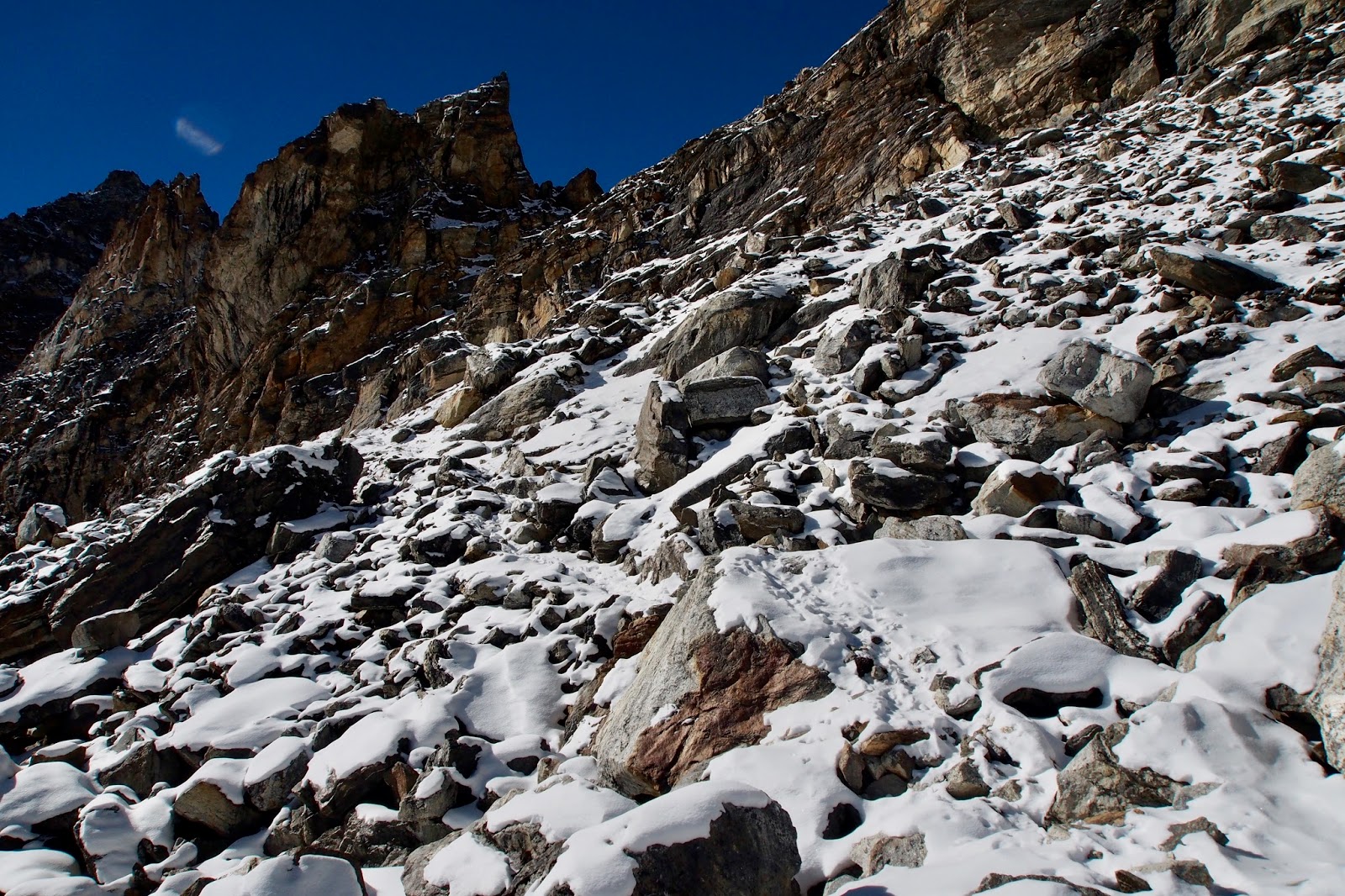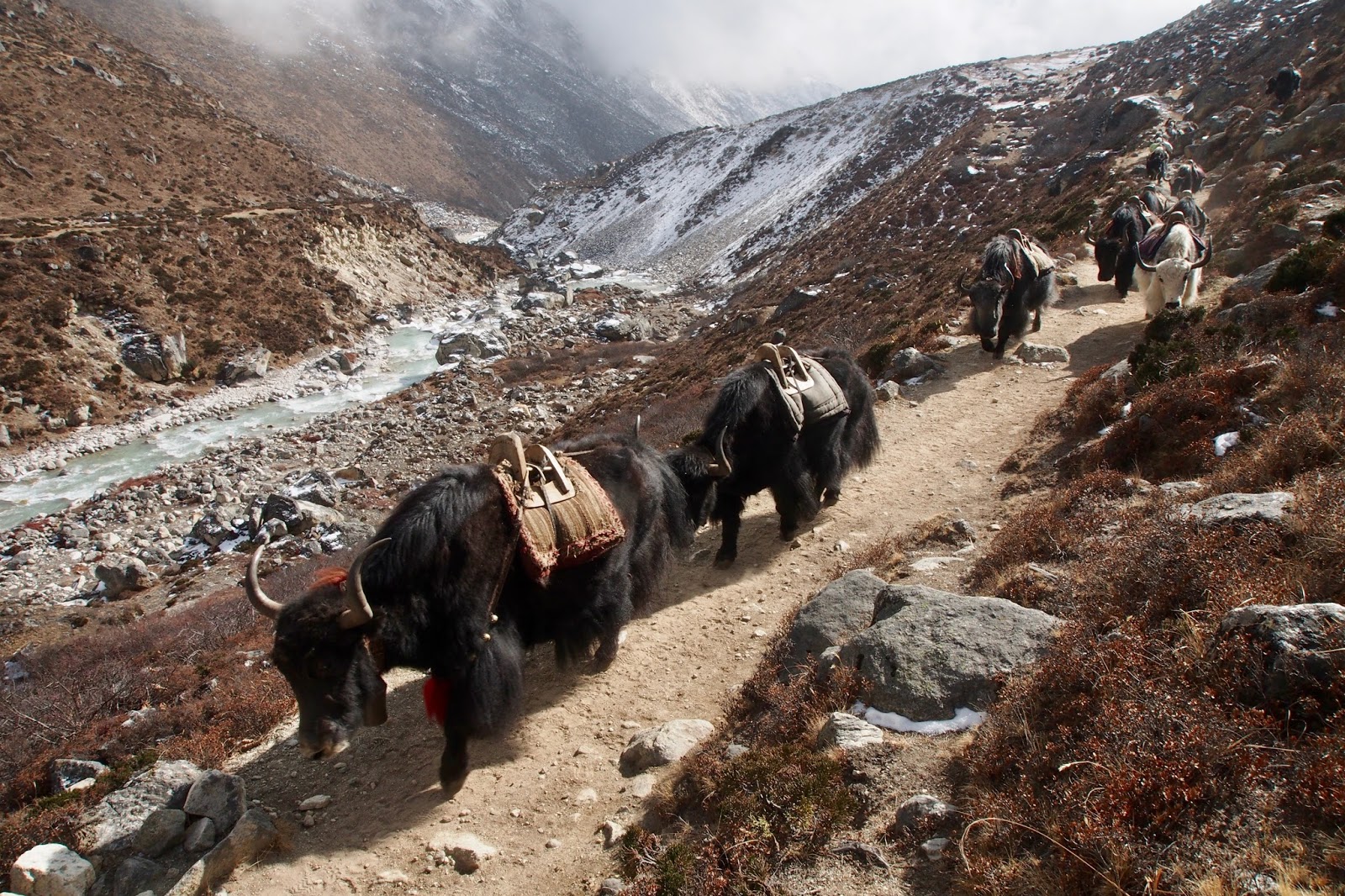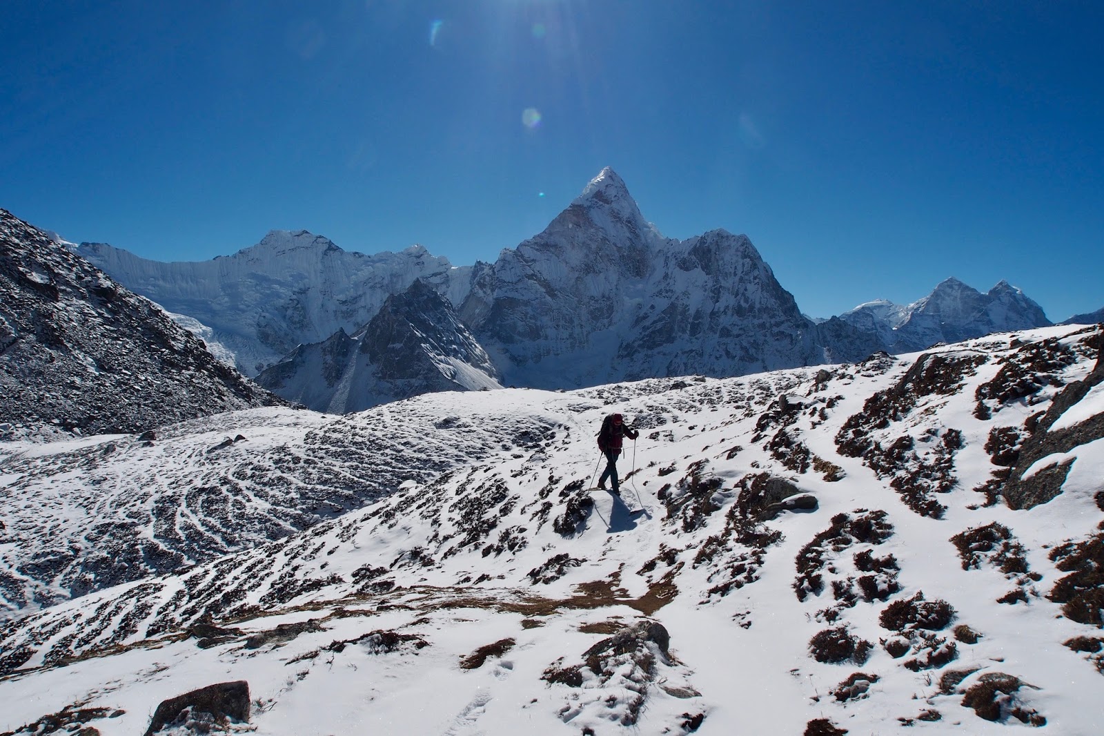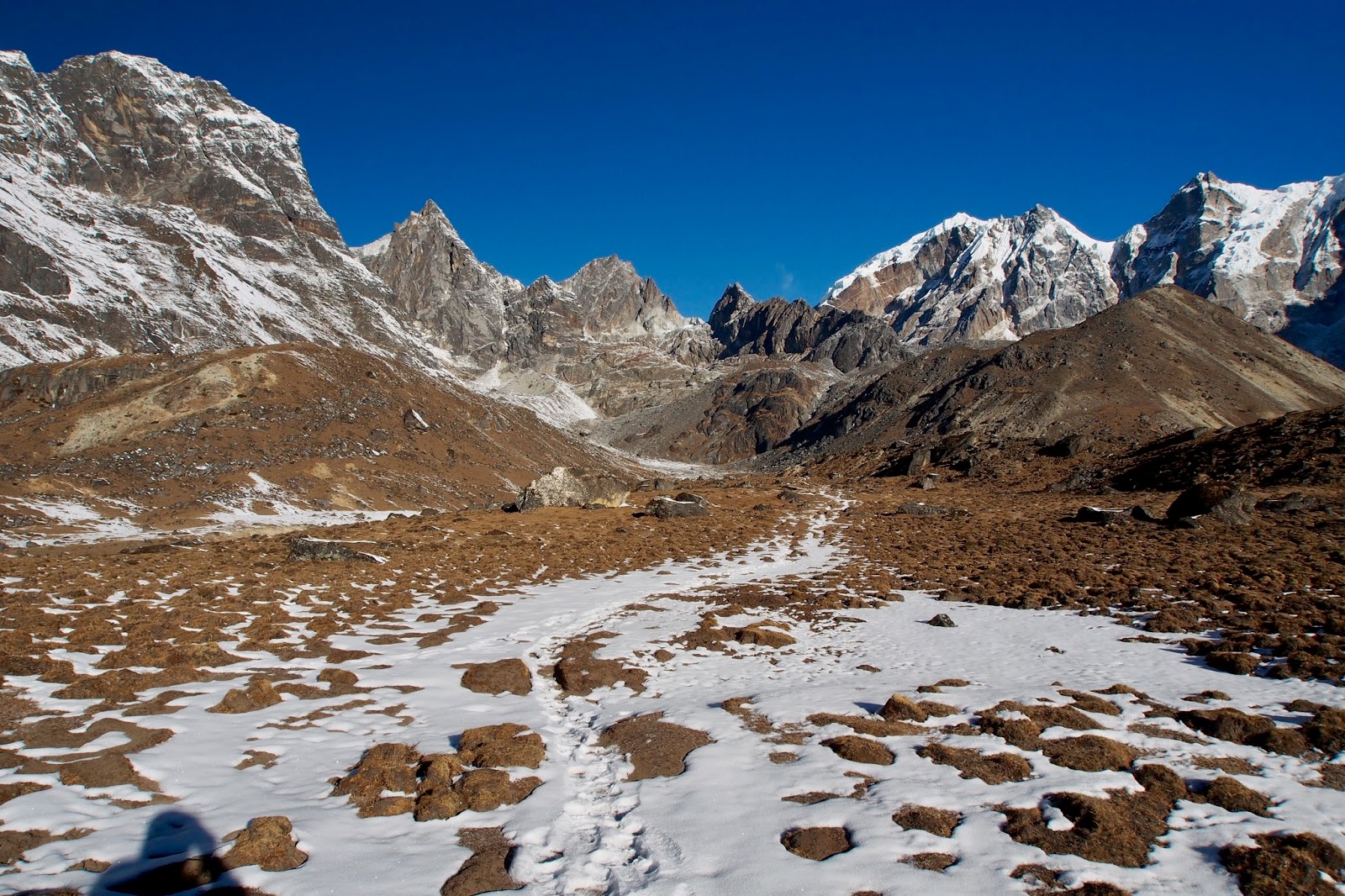 Dokonce i ráno se topí v kamnech v jídelně, super! Dneska je v plánu přejít Kongma La (5535 m) a dorazit do Lobuche. Dávám Lukasovi náskok – startuje asi 7:45, já až v 9 hod. Doháním ho asi za 2 hod. Zatím je to docela snadný terén, ale zrovna když se potkáme, tak to začíná být obtížnější. Cesta se ztrácí pod sněhem. Kupodivu tudy posledních pár dní nikdo nešel.