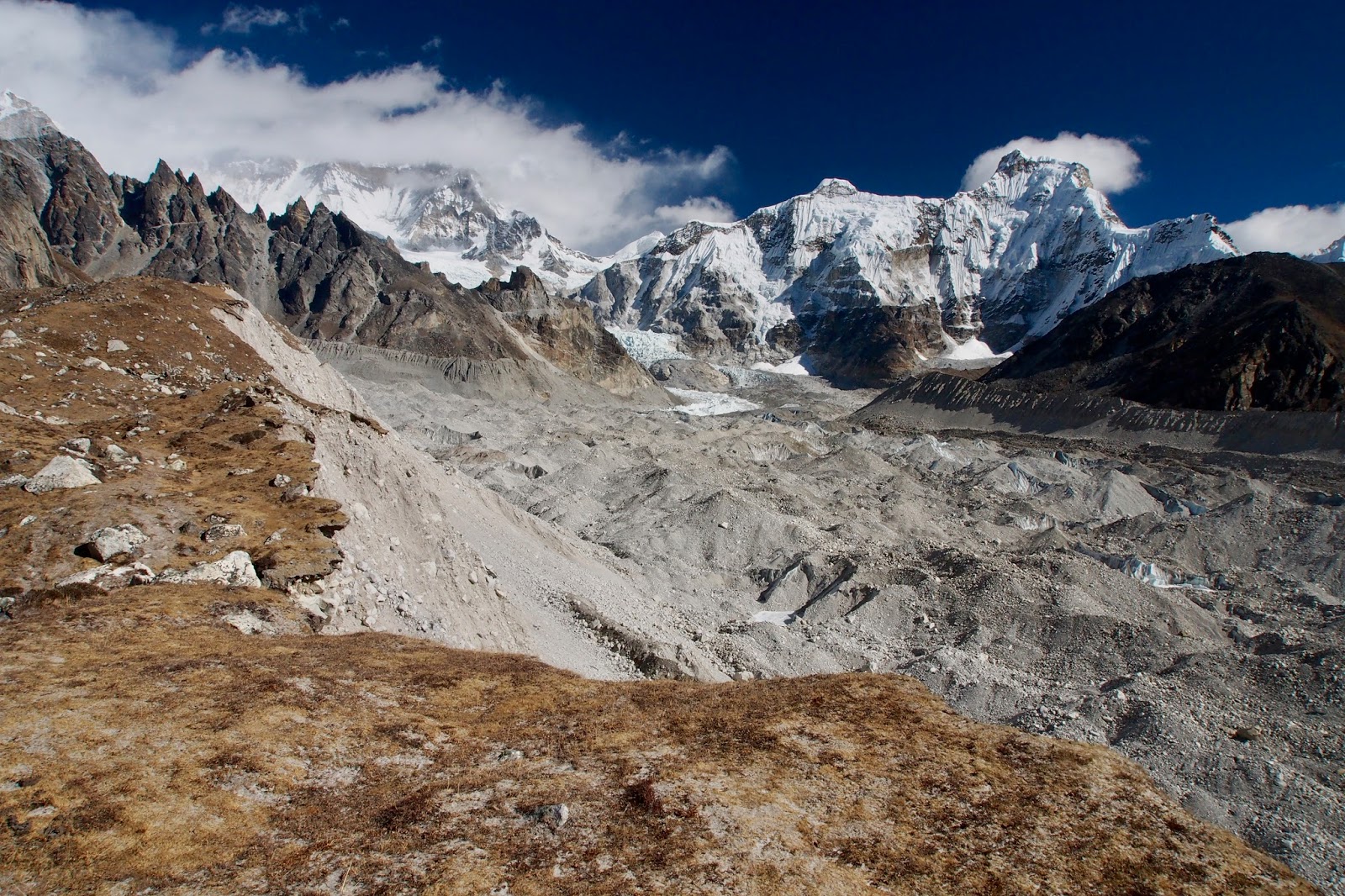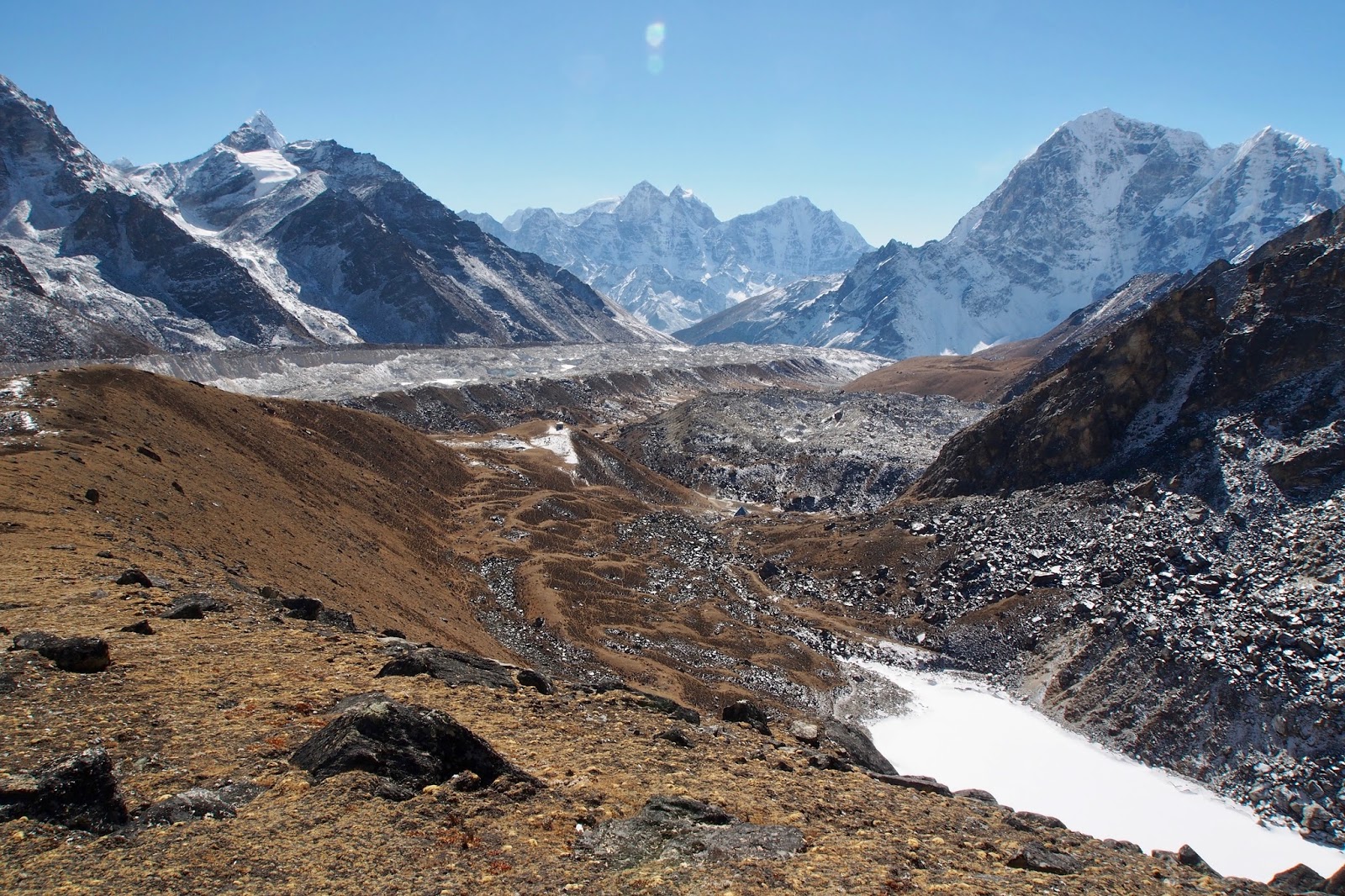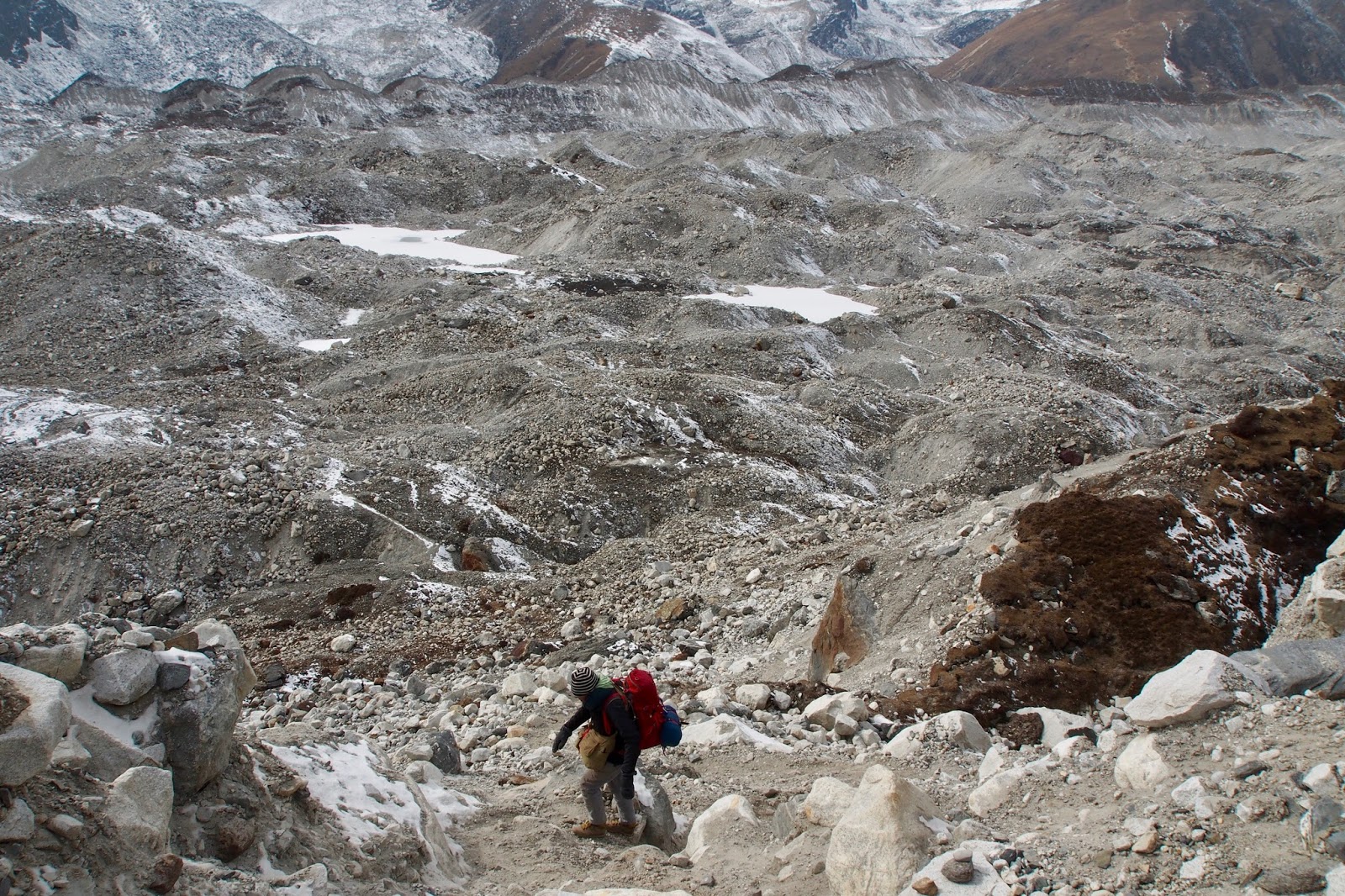 Dán šplhá na okraj ledovce. V pravém horním rohu je v tmavém svahu cestička. To je cesta na vyhlídkový kopec Gokyo Ri (5300 m) a pod cestičkou je skryté Gokyo (4800 m), můj dnešní cíl.