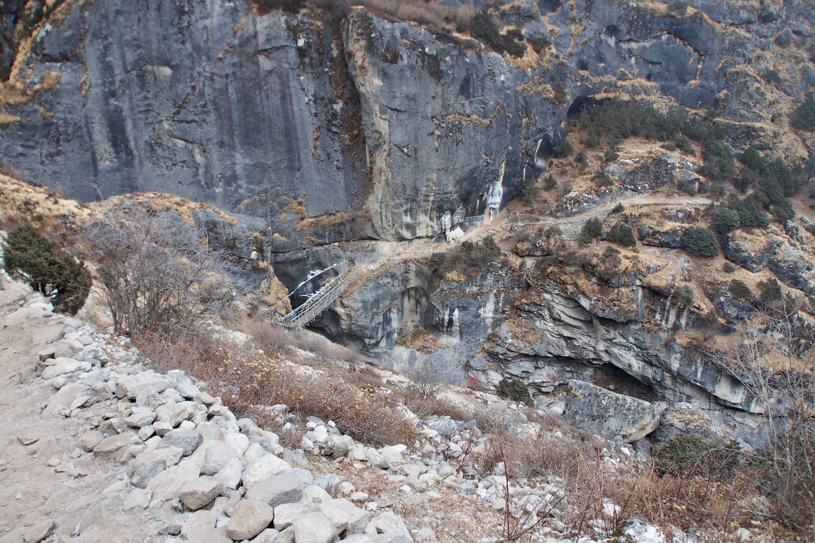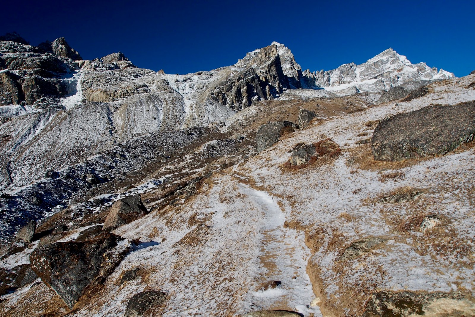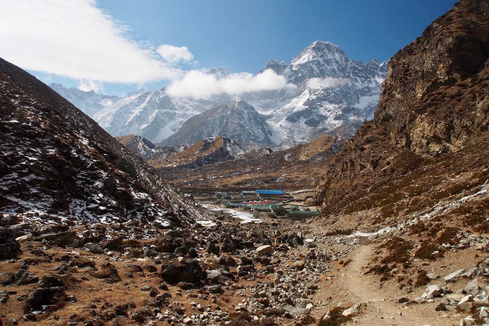 Cítím se pořád jaksi slabý. Ale tempo docela jde. Z Lobuche do Dzongla to má být 3 hod. Pyramida je o 15 min dál a trvá mi to celkově 2 hod 17 min. Ke konci je teda cestička dost náročná – zařezaná ve strmém svahu a hodně uzounká.