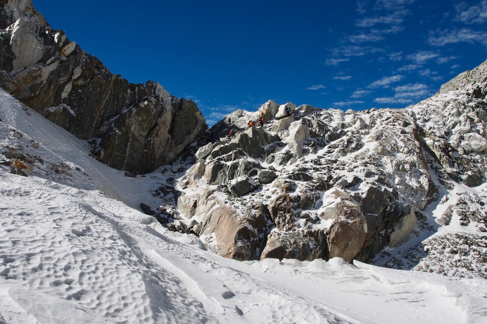 Nahoře se ukazuje, že k sedlu je to ještě kus. Potkáváme Itala, co jde z druhé strany. Hurá! Konečně nemusíme hledat cestu, stačí jít v jeho stopách. Ital doporučuje ubytko v Pyramidě. Je to Italské výzkumné středisko kus nad Lobuche. Účtujou si 30 USD za den all-inclusive – sprcha, elektřina, jídlo, čaj, káva…
