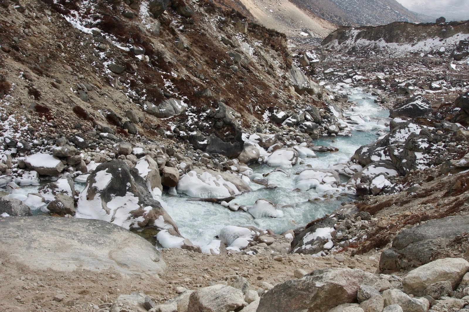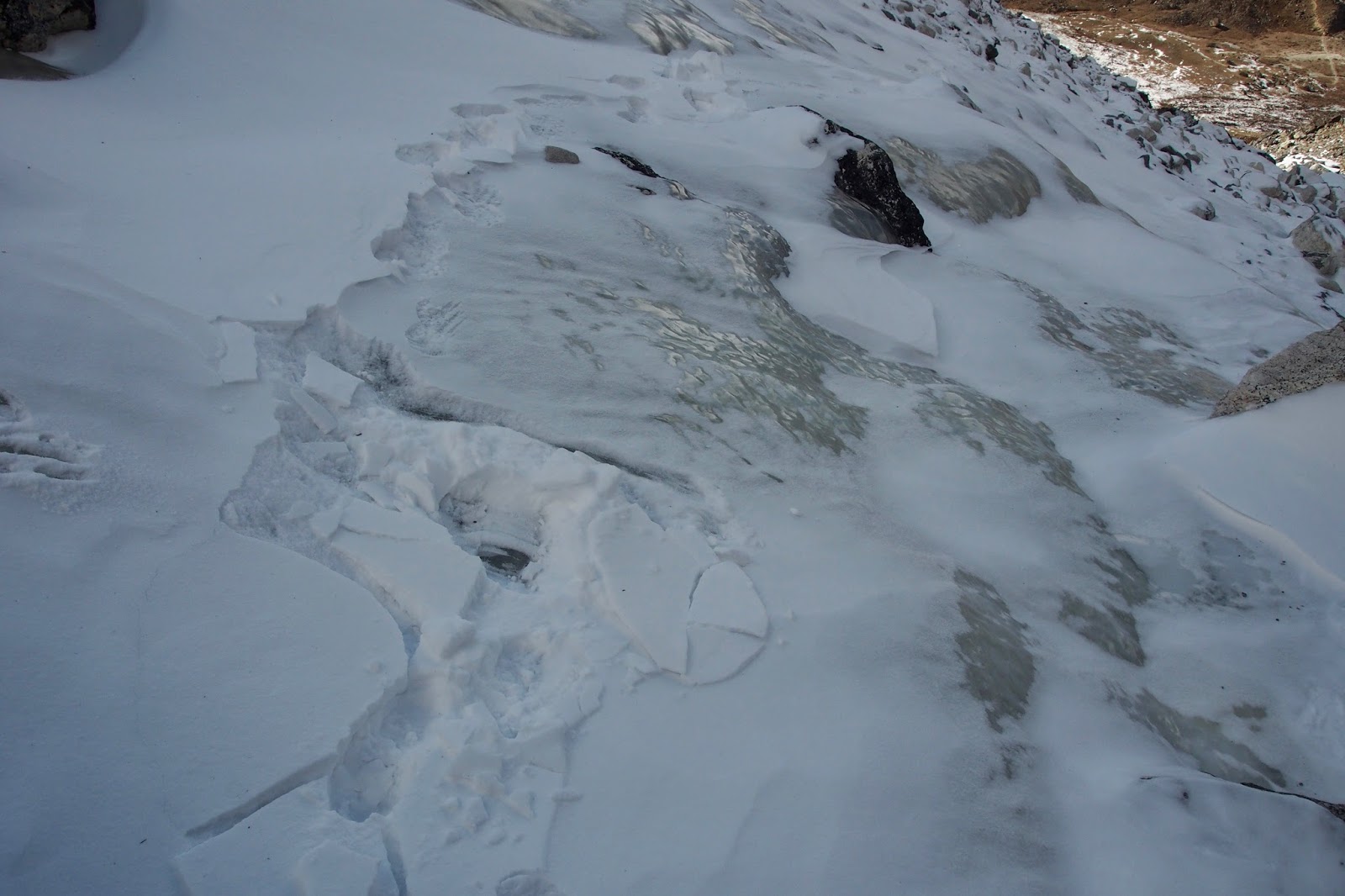 V 5:09 jsem na okraji ledovce, který se musí přetraverzovat. Potkám Dána, asi 40 let. Má co dělat. Dává mi lekci, abych šel opatrně a vyrazil brzo, pokud chci dojít z Gokya přes Renjo La až do Thame. Nevím, co těm lidem jebe. Přijde mi, že v Alpách takoví lidi nejsou. A to nejlepší nakonec: Cesta přes ten ledovec mu prý trvala 3 hodiny!!! Můj odhad byl 1 hod, max 1 1/2. A taky že jo. Bylo to náročné to přejít, ale v čase 6:16 jsem v Gokyo Resortu. Takže přejít ledovec skutečně trvalo asi hodinu.