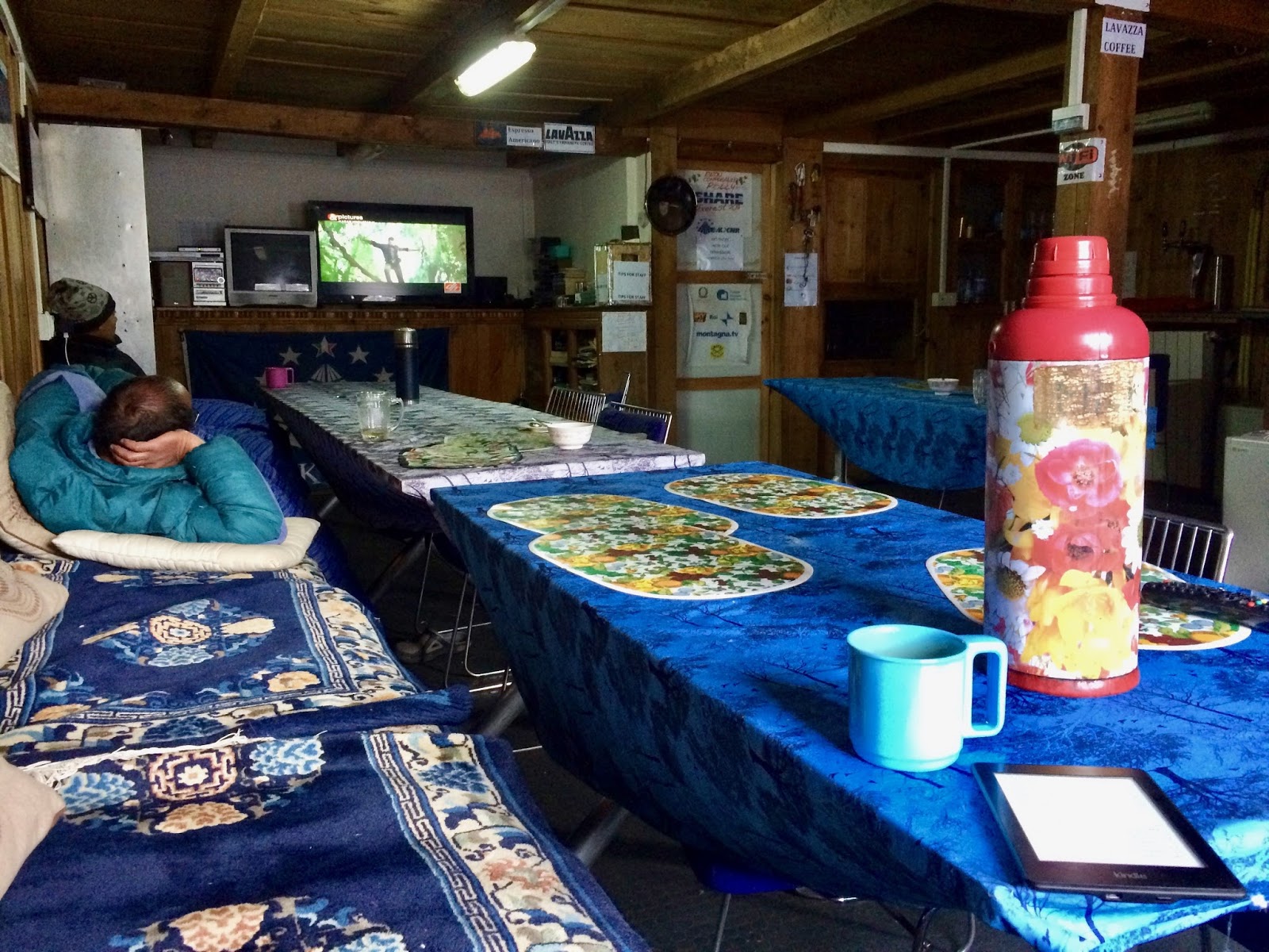 V jídelně je neuvěřitelně teplo, skoro ani není třeba péřovka. Později přišel ještě jeden pár (asi UK) s guidem a nosičem. Japonec má i stan a vařič a většinou kempuje.