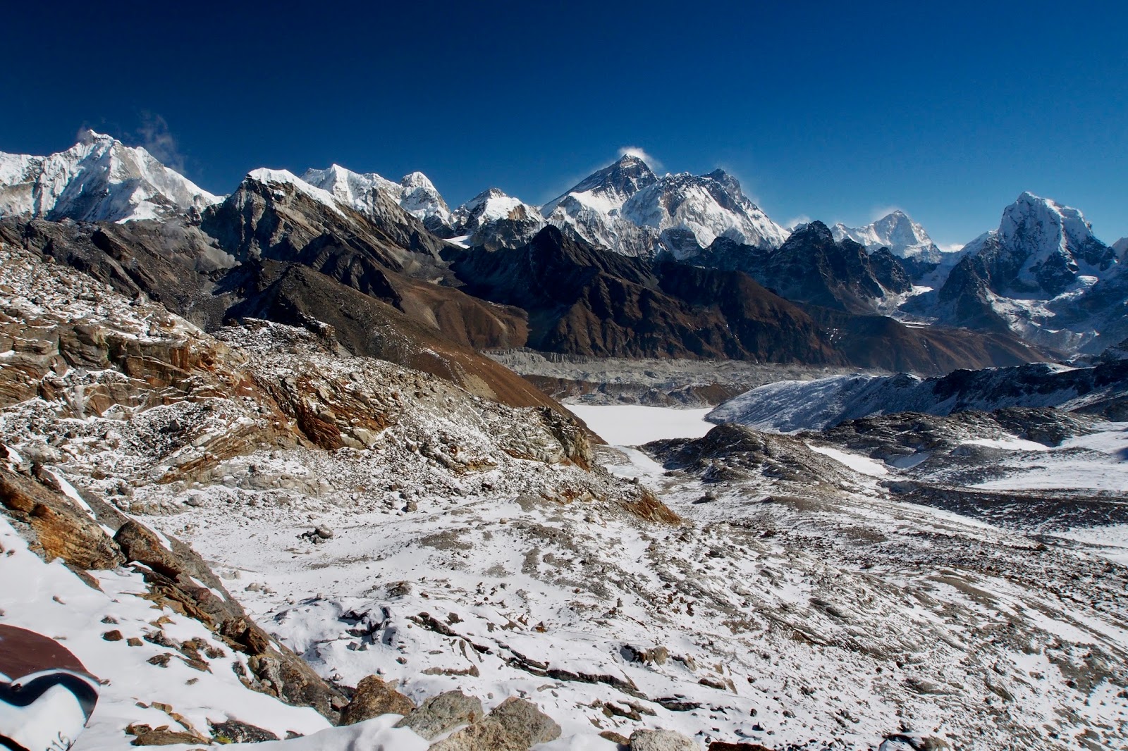 Uprostřed Everest. Pod ním 3. jezero u Gokya, které na vzdálenějším břehu.