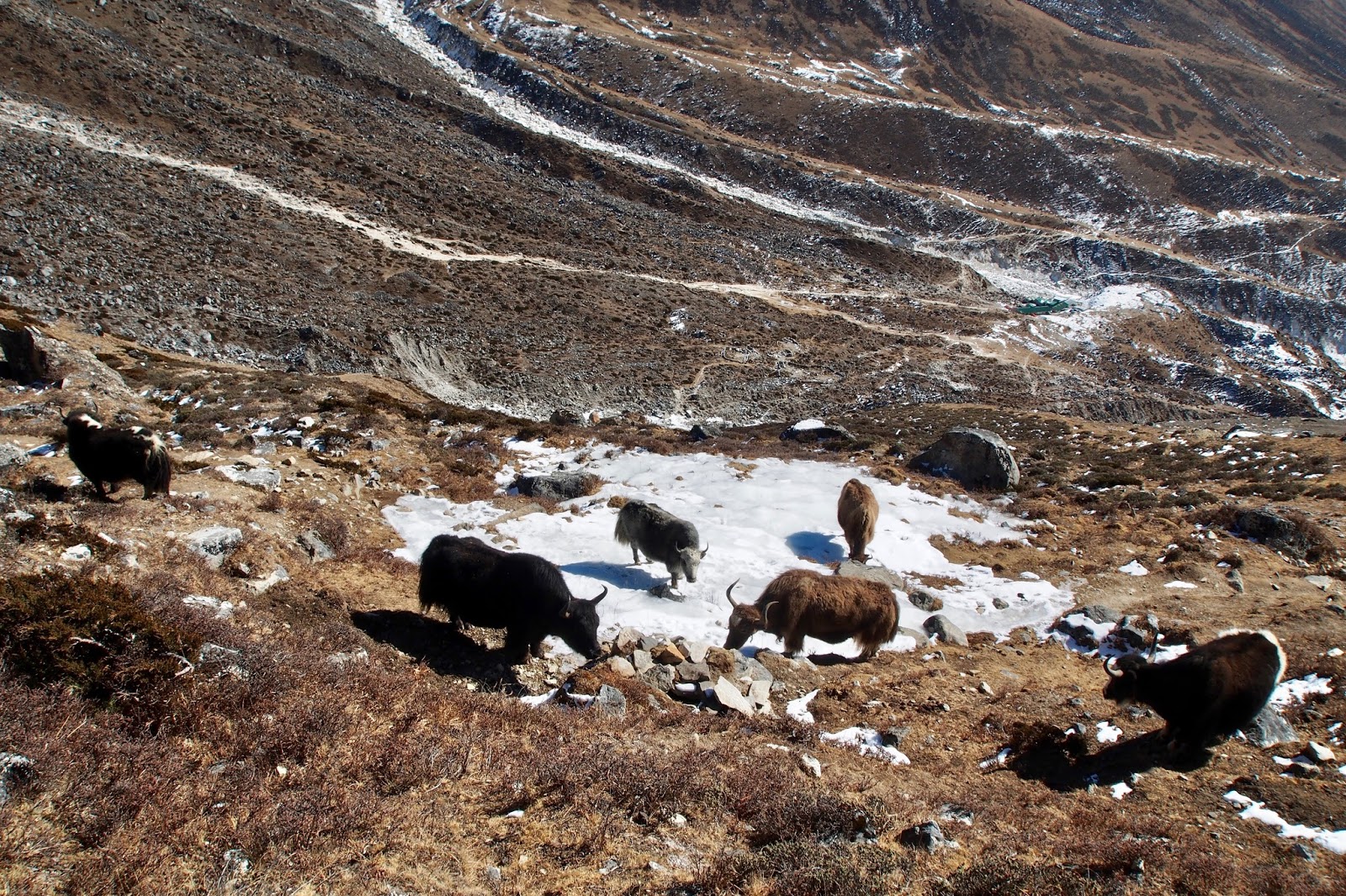 Stádečko jaků se páslo na mojí stezce. Tentokrát jsem je raději velkým obloukem obešel.