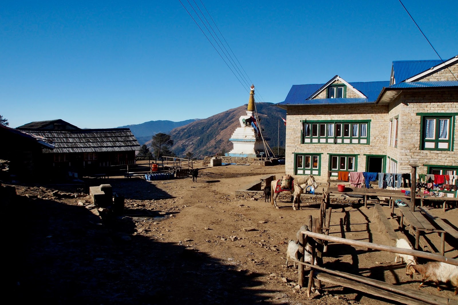 Sice jsem si tentokrát na tu zimu tam nahoře už trochu zvykl a už mi to tolik nevadilo. Ale stejně jsem se už těšil, až slezu níž a venku bude zase teplo. To se mi včera při sestupu do Namche nevyplnilo – jelikož bylo hnusně, tak byla zima i v Namche. Ale teď je tu nový den a s ním krásná modrá obloha! Teplo!