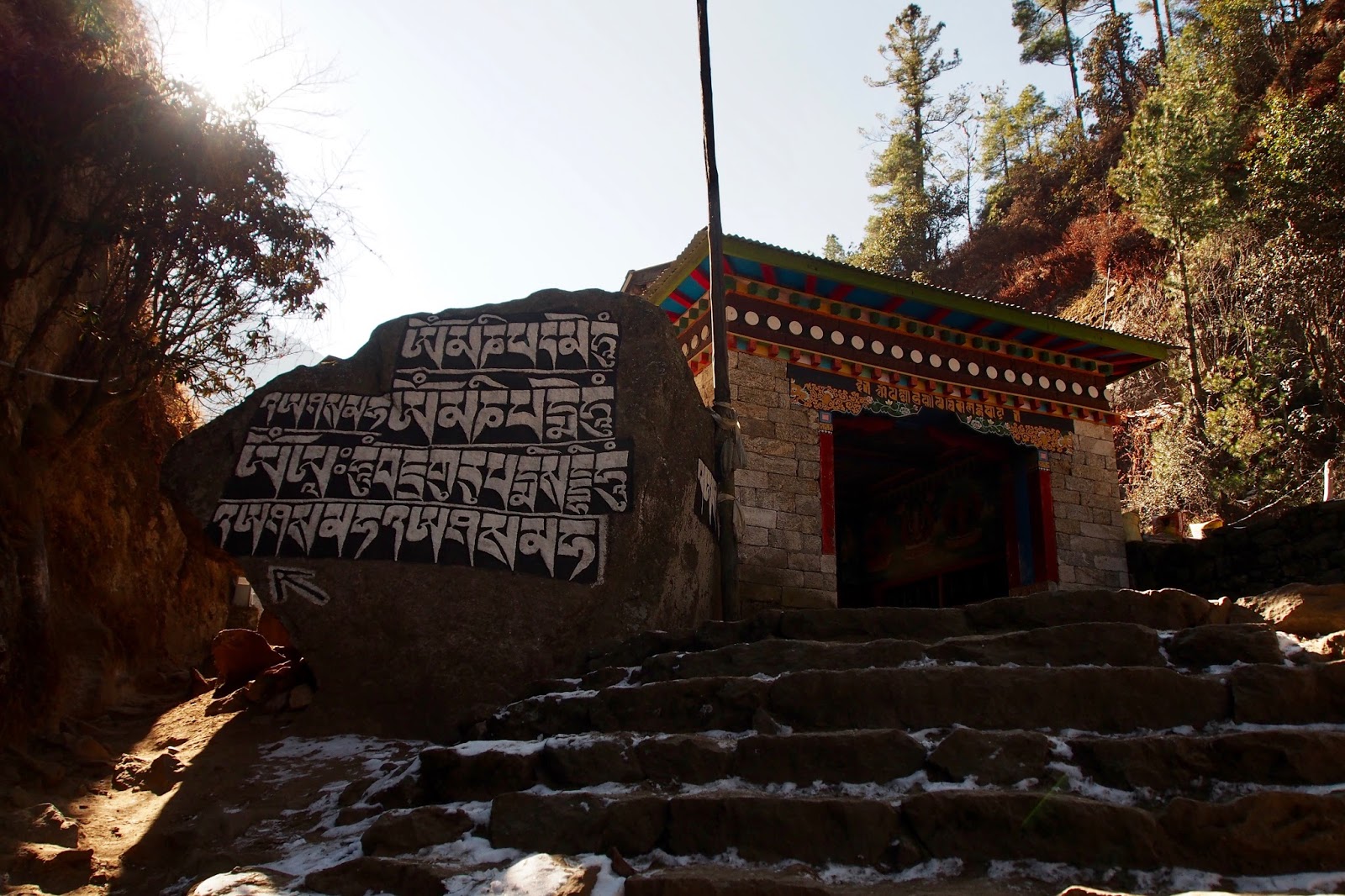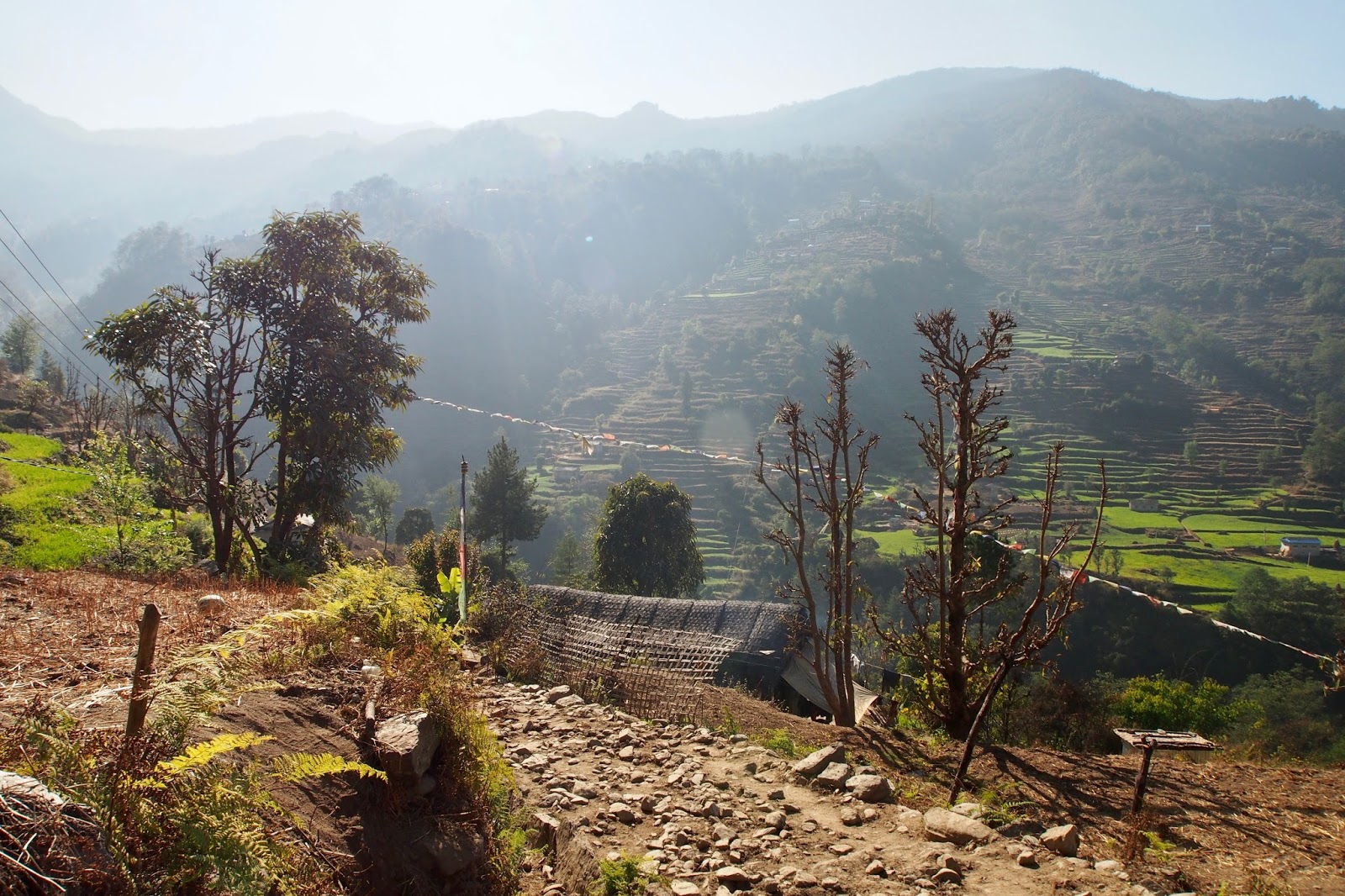 Dole v 1500 m se přejde přes řeku a pak hurá 1500 m stoupání! Asi v půlce kopce je Nunthala, chvíli jsem váhal, jestli tam nezůstat, ale nakonec jsem se rozhodl pokračovat vzhůru. Nakonec jsem asi 17:15 dorazil až do Taksindu. Myslel jsem, že odsud už jezdí jeep, ale to až z Ringmo, takže zítra se ještě hodinku projdu. (Nakonec jsem z Ringmo ještě šel dolů do Phaplu.)